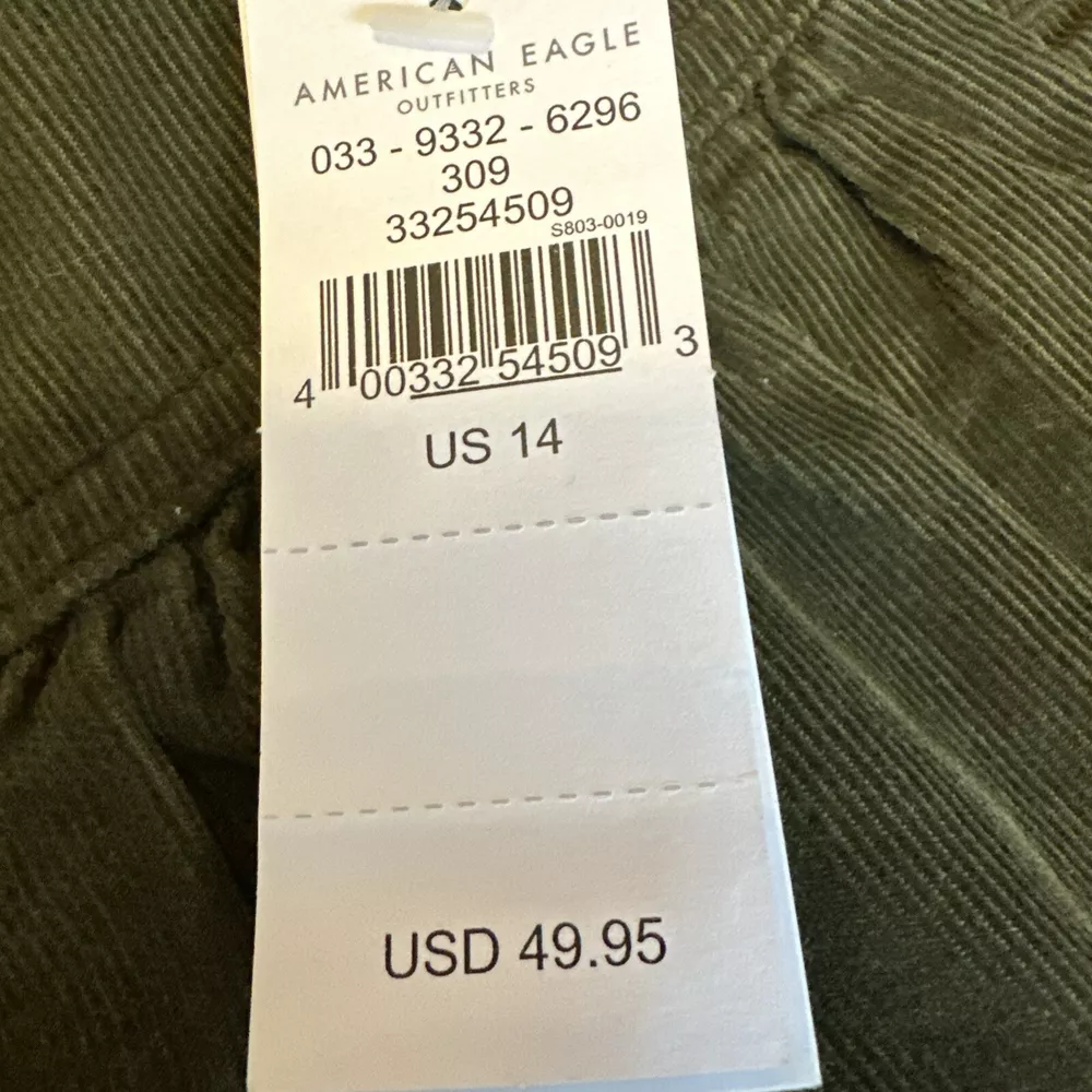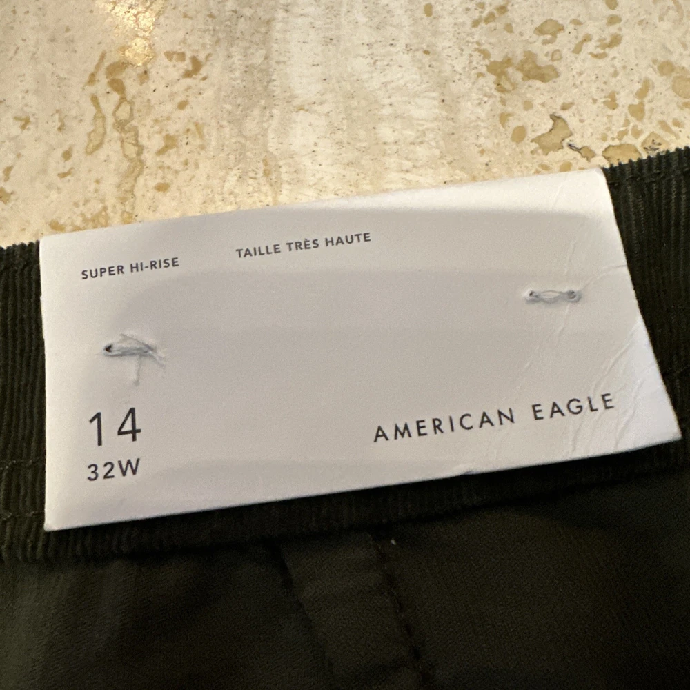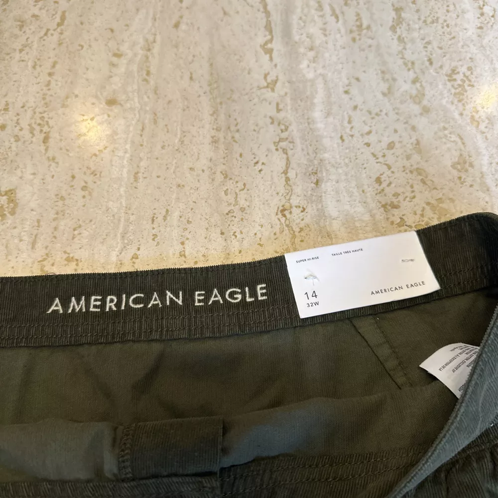 The American Eagle Super High Rise A-Line Corduroy Skirt in size 14 is a stylish and versatile addition to any wardrobe. This olive green skirt features a solid pattern with a button closure, crafted from comfortable corduroy fabric. The high rise and A-line silhouette offer a flattering fit, while the addition of pockets adds functionality to this fashionable piece. Perfect for casual or dressier occasions, this skirt from American Eagle Outfitters is a must-have for women looking for a chic and on-trend wardrobe staple.