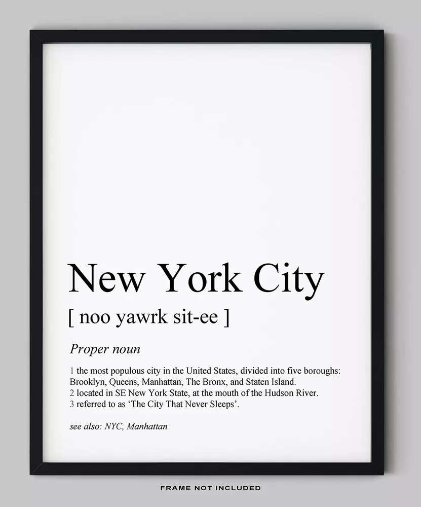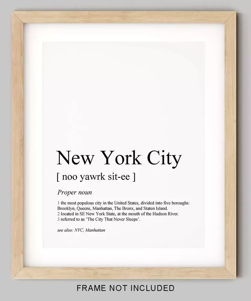 This wall print features a replication of a dictionary definition of the city of New York! PERFECT GIFT! This wall print is a perfect gift for mom's, dad's, men, women, friends, sister, brother or for yourself! It is great as a Mother's Day gift, Father's Day gift, anniversary gift, birthday gift, or at any time of year! READY TO FRAME - Frames to fit these 8x10 inch print is easy to buy here on or at any department or craft . Choose the frame color, width & mat sizes that work with your decor for the perfect look in your home! QUALITY PRINTS, MADE TO LAST - Our designs are printed on Crystal Archive Type II photographic paper (light sensitive and long-lasting). It has a luster, flat matte finish with a slight, subtle sheen and a minimal texture that brings a nice depth and quality to the artwork. Ready to be framed! PROTECTIVE PACKAGING FOR SAFE SHIPPING Prints are packaged & shipped in a sturdy 'stay-flat’ envelope specially designed to protect photographs and artwork during shipping. However, if a print is damaged during transit (these things happen!), just get in touch and we’ll ship a right away.