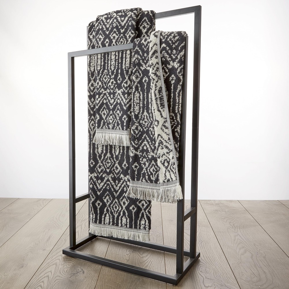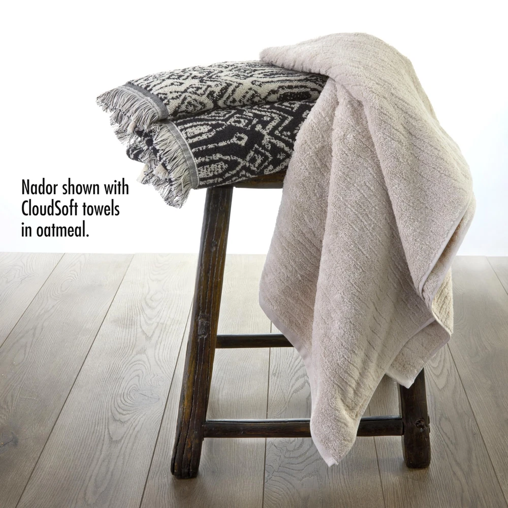 Includes 2 hand towels Plush cotton terry with a unique, 2-tone jacquard pattern and fringed hem Colors in pattern are opposite on reverse side Coordinating bath towels sold separately Certified Standard 100 by OEKO-TEX (free from harmful chemicals)