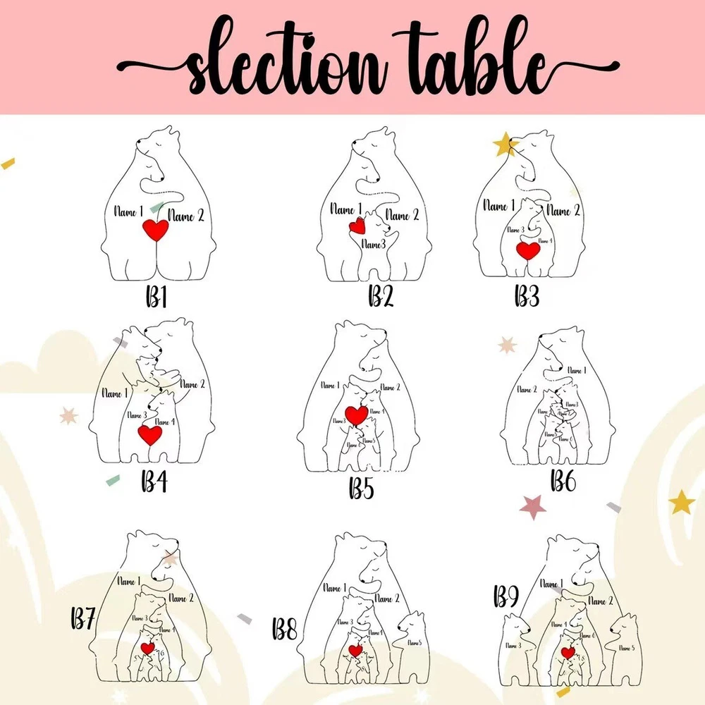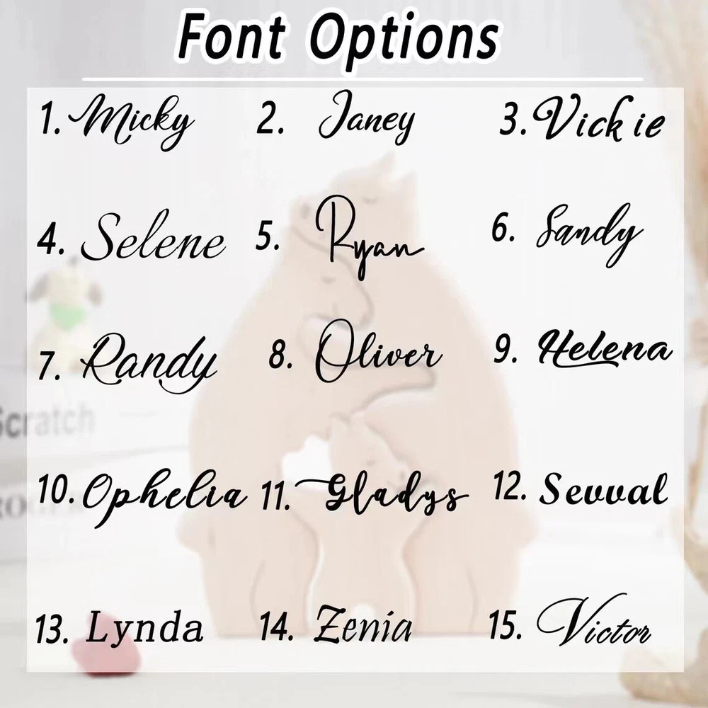 Send us an email with the text you need customized , You can tell us your and your family's names and we can engrave them on the bear as a memen to and gift! By clicking "Customize", you agree to these Terms and Conditions. Our personalized wooden bear-shaped puzzle is a unique keepsake that highlights family unity and love. With each family member's name intricately carved into the puzzle pieces, it stands as a heartfelt symbol of togetherness. Measuring 4-6 inches in size and crafted with exquisite detail, this puzzle not only serves as a captivating piece of decor but also makes for a thoughtful gift for birthdays, special occasions, or new home celebrations. Beyond its aesthetic appeal, it becomes a cherished family memento, preserving treasured memories. We are dedicated to ensuring customer satisfaction with prompt service for any concerns or issues. Personalized Family Keepsake: This custom wooden bear-shaped puzzle is more than just a decor item; it symbolizes the love within your family. Each family member's name is meticulously carved into the wooden pieces, creating a unique artwork that reflects the deep bonds and unity among family members Exquisite Wooden Craftsmanship: Measuring approximately 4-6 inches (10-15 centimeters) in size and 0.7 inches (1.8 centimeters) in thickness, this wooden puzzle features a distinctive bear shape. It serves as a visually striking decoration that enhances the artistic atmosphere of your home Thoughtful Gift Choice: Whether for a mother's birthday, a father's special occasion, or a new home celebration, this personalized wooden bear puzzle is the perfect choice. It not only shows deep affection for your loved ones but also adds a warm and treasured touch to any special occasion Cherished Family Memento: This puzzle is not just a decoration but a valuable family keepsake. Given as a gift to parents, children, or for a new home, it becomes a meaningful reminder of family bonds and unity, preserving precious memories and strengthening family connections Quality Customer Service: We are committed to providing excellent products and service. If you are not satisfied with the product or if there is any damage during shipping, please contact us promptly. Our customer service team will respond within 24 hours to resolve the issue and ensure you have a pleasant shopping experience