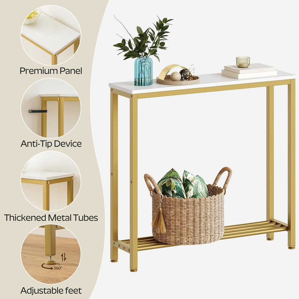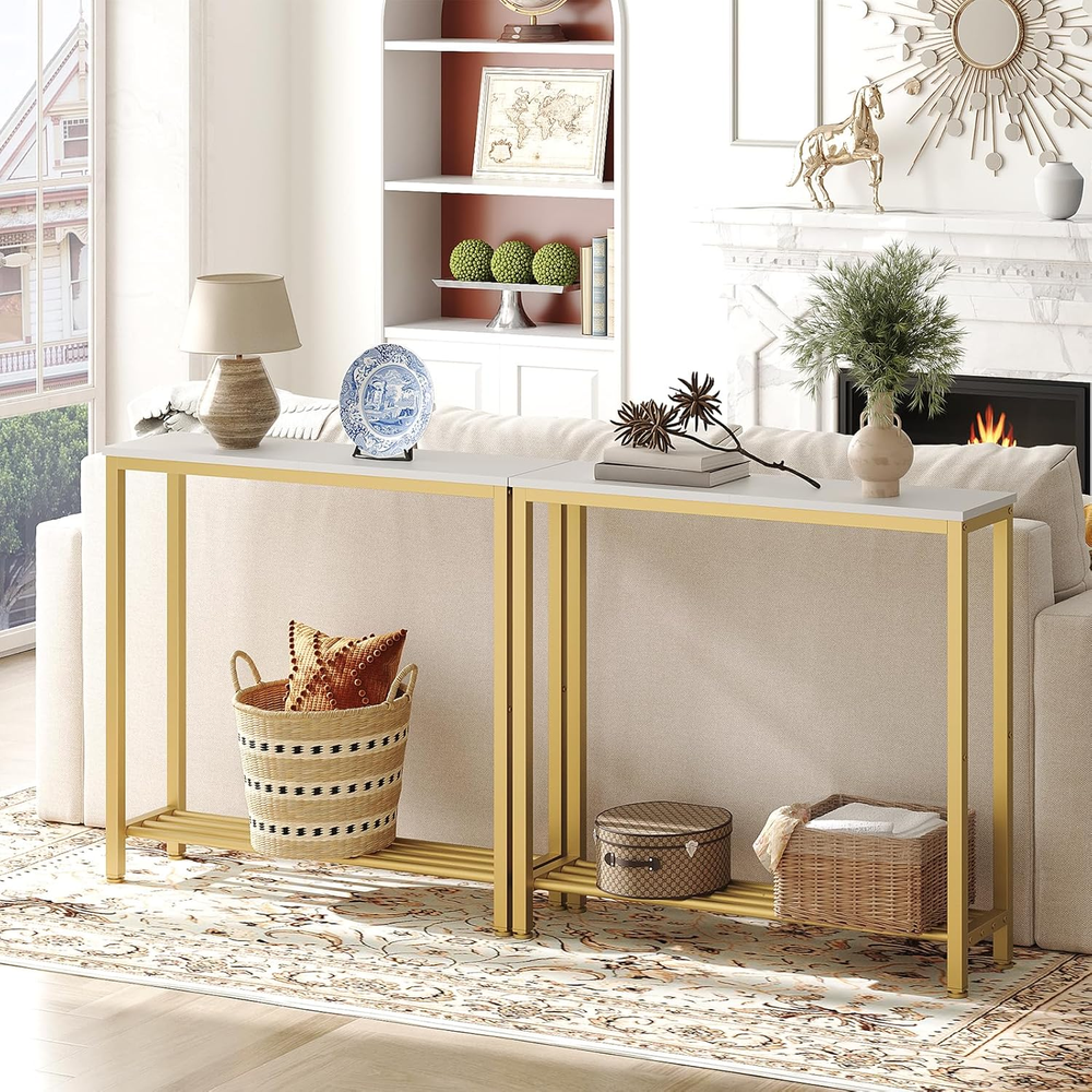 Space-Saving Master: With dimensions of 29.5"L x 7.9"W x 29.5"H, this console table is designed for small spaces. Featuring a double-layer layout and retro-inspired aesthetic, it effortlessly fits into tight corners, becoming your professional storage solution Stable Construction: The sofa table features 0.8mm thickened metal pipes for exceptional stability, complemented by the premium, easy-to-clean particleboard for a sturdy and reliable structure that ensures long-lasting use. Its top is capable of supporting up to 55 lb Versatile Table: More than just a chic addition behind the couch, this table is an ideal companion for entryway, hallway, study, and balcony. Magazines, plants, or daily essentials can be placed on it to fulfill your diverse lifestyle needs Secure Use: This behind couch table is equipped with an anti-tip device to enhance overall stability and ensure a safety experience. Four adjustable feet at the bottom flexibly adapt to various surfaces, protecting your floor from scratches Easy Assembly: Each part is thoughtfully numbered, accompanied by a detailed installation guide, a full set of tools, and spare screws. The setup is so simple that even novices can complete it in no time, providing you with instant access to your dream furniture Product Description YATINEY 29.5 Inches Narrow Console Table, Perfect For Small Spaces This hallway table occupies a small area and can be placed in the living room hallway, by the sofa in the living room, in the bedroom, and in multiple scenarios. The Console Narrow Sofa Table Can Fully Save Your Space Open shelves occupy very little space, but store a lot of things. Perfect for storing books, baskets, vases, plants, and other small items. More Detail About Sofa Table Double-Tier Shelving Designed with two tiers, the entryway table offers ample storage space for your belongings. Thickened Metal Pipes The 0.8mm-thick metal frame provides solid and reliable support for the tabletop. High-Quality Particleboard Crafted with premium panels, the tabletop is sturdy, serviceable, and easy to clean. Anti-Tip Device Secure it to the wall to prevent wobbling and tipping, enhancing overall stability. Adjustable feet The 4 adjustable feet keep the console table balanced even on uneven floors. Specifications Color White, Gold Material Particleboard, Metal Dimensions 29.5"D x 7.9"W x 29.5"H Weight 9.7 lb Max.Static Load Bearing of Top 55 lb Package Contents 1 x Console Table;1 x Accessory Package;1 x Anti-Tip Device;1 x Assembly Manual Different Choice for You Add to Cart Add to Cart Customer Reviews 4.3 out of 5 stars 38 4.4 out of 5 stars 26 4.1 out of 5 stars 44 4.4 out of 5 stars 285 4.4 out of 5 stars 90 — 4.6 out of 5 stars 66 Price $59.85 $ 59 . 85 — $31.99 $ 31 . 99 $58.79 $ 58 . 79 $56.09 $ 56 . 09 $56.79 $ 56 . 79 $29.39 $ 29 . 39 Color Rustic Brown, Black Rustic Brown, Black Rustic Brown, Black Rustic Brown, Black Rustic Brown, Black Rustic Brown, Black Rustic Brown, Black Top Board Size 70.9"L x 5.9"W 29.5"L x 9.4"W 29.5"L x 8.7"W 71.0"L x 7.0"W 70.9"L x 5.9"W 55.1"L x 7.8"W 17.0"L x 11.0"W Total Height 29.5"H 29.5"H 29.5"H 32.0"H 32.3"H 31.4"H 11.4"H Material Particleboard, Metal Particleboard, Metal Particleboard, Metal Particleboard, Metal Particleboard, Metal Particleboard, Metal Particleboard, Metal Assembly ✔ ✔ ✔ ✔ ✔ ✔ ✔