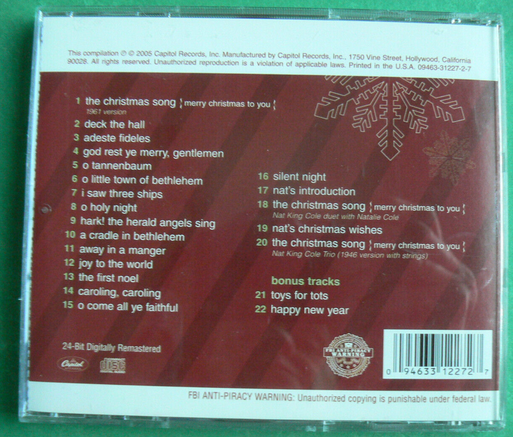 The Christmas Song NAT KING COLE 2005 Compilation, Capitol Records, EMI Review: Like Bing Crosby's "White Christmas," Nat Cole's "The Christmas Song" stands as one of two or three pillars of holiday music. This collection of songs and greetings includes another technologically induced daughter-father duet on Mel Torme's classic hit as well daddy Cole's 1961 version of the tune. Fans of both Natalie and her dad will put this on the top of their wish lists. Two previously unreleased tracks--"God Rest Ye Merry Gentleman" and "O Come All Ye Faithful"--will prompt a lot of lovers of Christmas music to fall in love again with Cole's incomparable style and timeless voice. This CD is in like-new condition and contains 22 tracks and was compiled and released in 2005. It is no longer sealed, but it shows no sign of use whatsoever; all paperwork (10-page booklet) is included too. The plastic jewel case has a diagonal crack on the front -- CD is not affected at all! ~~~~~~~~~~~~~~~~~~~~~~~~~~~~ I normally mail ON the day I receive payment if it's received before 1 p.m. central time, and the next day if it's later than 1. Please take a look at my other listings; I'm listing many school books (and other items) and am happy to combine shipping! Items from smoke-free, pet-free home. Thanks so much for your time! Before leaving your feedback, if for any reason you feel I did not deserve or earn 5 stars in each category, please let me have the opportunity to make it right. I want every transaction to be 5-star worthy! Thanks so much! :)