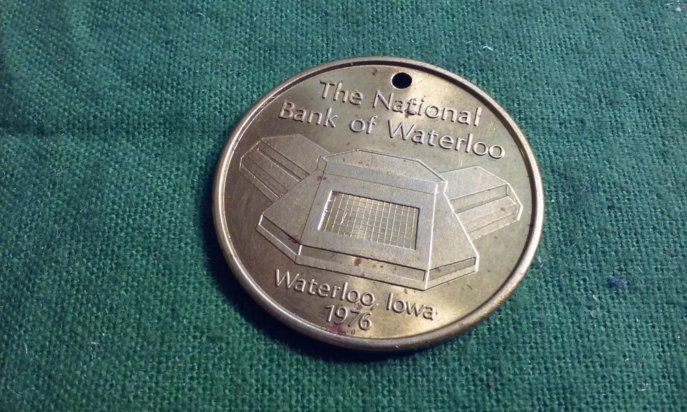 National Bank Of Waterloo Iowa Gold-Tone Coin Token Fob Unique # (15658), with Return Postage. Free Shipping!