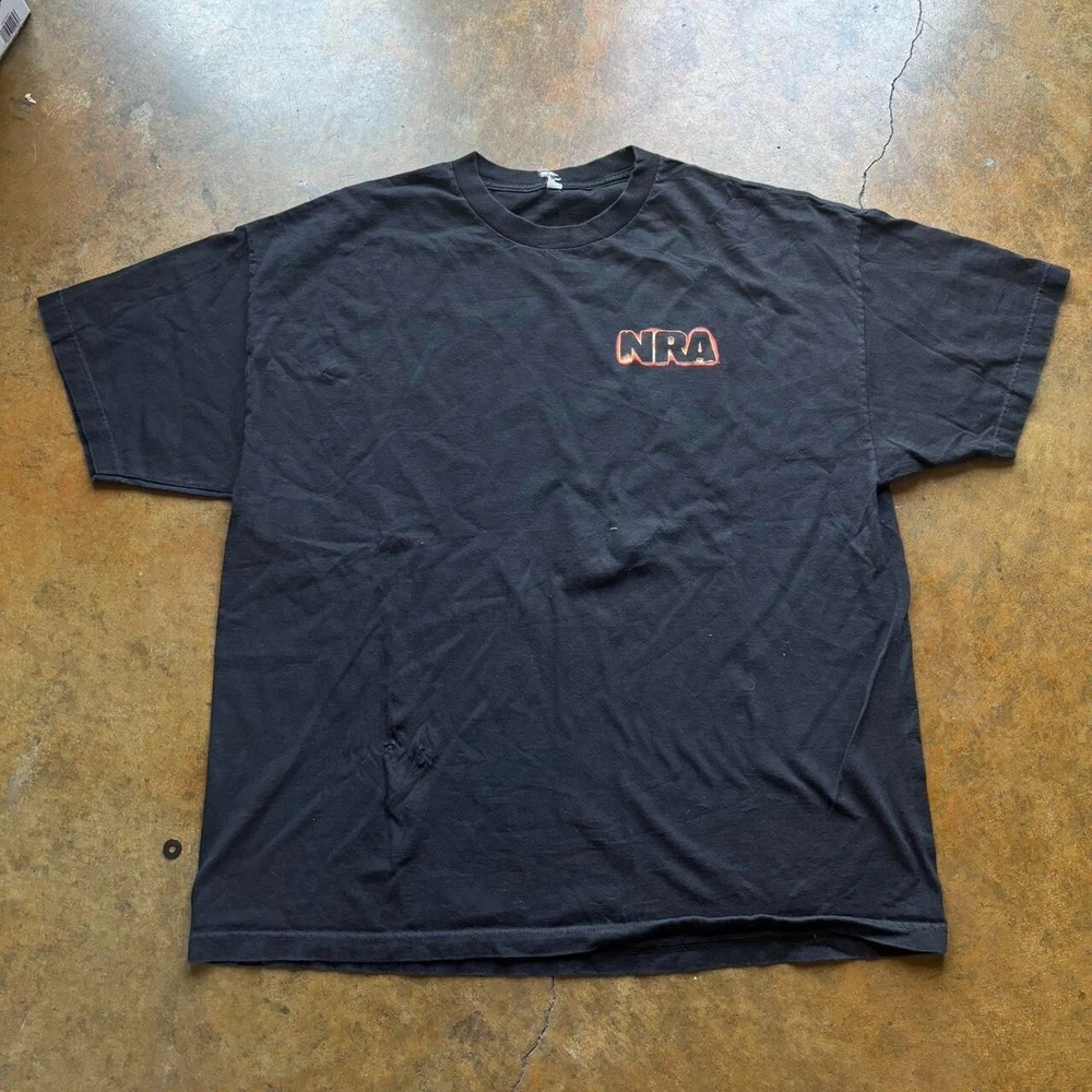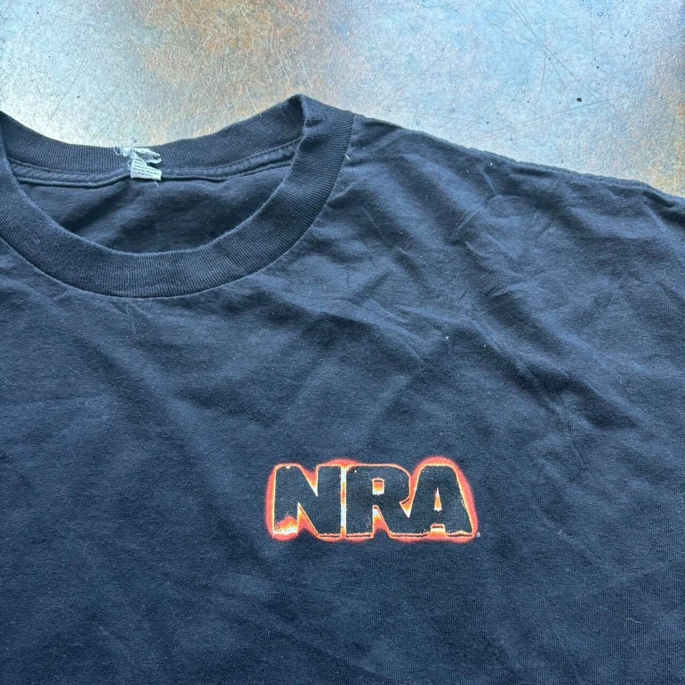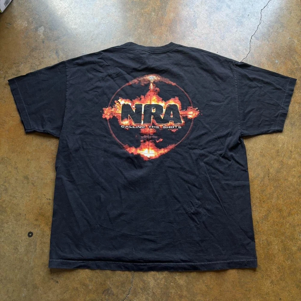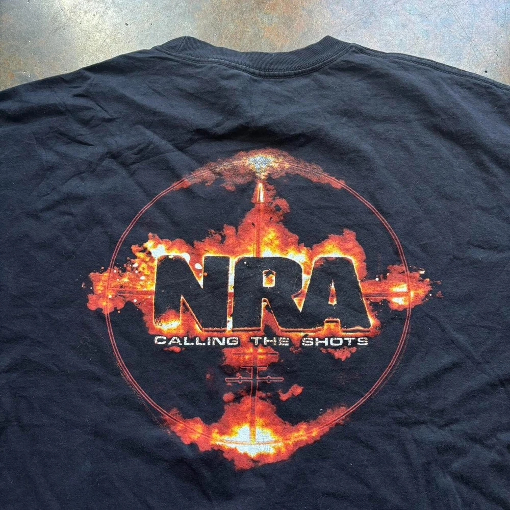 National rifle association “calling the shots” t-shirt with really cool gun scope graphic with flames on the back. Mens 2xl Pit ➡️ pit: 25” Length: 30”