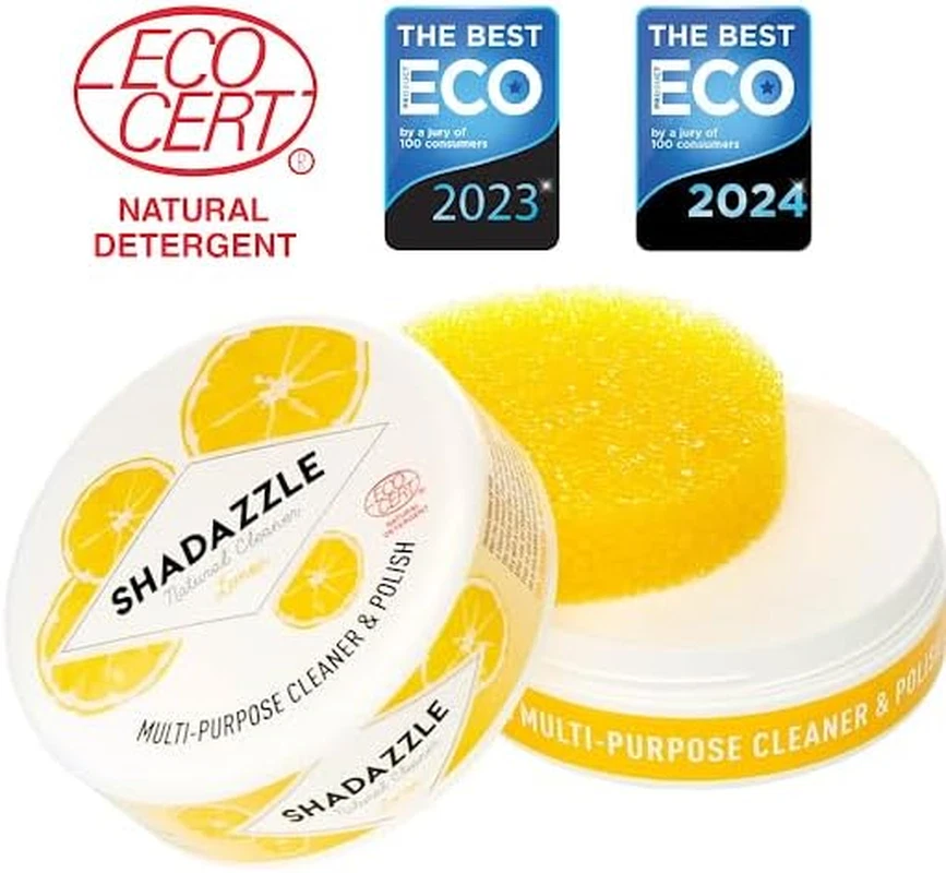 NATURAL ALL PURPOSE CLEANER : Shadazzle is a multi purpose cleaner that works on any washable surface. It is made with natural ingredients only : clay, vegetal oil, vegetal glycerin, lemon fragrance. No harmful chemicals or phosphates ! WHERE TO USE : any kind of metal, ceramics, porcelain, marble, wood... Very effective on stainless steel, silverware, jewelry, glass shower doors, glass stove tops, or even car wheels. CLEAN & POLISHES in just one step ! Shadazzle will do wonders on the surface you clean, but will definitely not scratch it or leave any streak. HOW TO USE : Wet the included sponge, rub it on the product and make it foam. Use the foam to clean everything. Wipe it with a clean and dry towel. ECOLOGICAL AND ECONOMICAL : Shadazzle will help you clean the whole house, saving you time, space and a lot of money ! One tub of Shadazzle lasts much longer than any liquid detergent. Product Description Shadazzle is a multi purpose cleaner and polish ! Certified by Ecocert Effective on every washable surface Made from clay and other natural ingredients Available in 4 scents : lemon, eucalyptus, lavender and grapefruit Won the Best Eco Product of 2023 and 2024 Shadazzle All Purpose Cleaner & Polish Clean everything and get rid of stains with Shadazzle: the one-of-a-kind cleaner that will replace your chemical cleaning products. Shadazzle is a multi-purpose cleaner and polish. Made from natural ingredients only . No chemicals, no phosphates. It’s the best way to clean everything while having no impact on the environment Shadazzle is effective on every washable surface: Cleans your kitchen: stainless steel appliances, countertops, inside your fridge, stovetops, pots and pans Keeps your bathroom clean and shiny: ceramics, shower doors, and tiles Don't forget your car and outside your home: tires, PVC patio furniture and more Shadazzle is a multi-purpose cleaner and polish Certified by Ecocert Effective on every washable surface Made from clay and other natural ingredients Available in 4 scents: lemon, eucalyptus, lavender and grapefruit Shadazzle is a multi-purpose cleaner and polish Certified by Ecocert Effective on every washable surface Made from clay and other natural ingredients Available in 4 scents: lemon, eucalyptus, lavender and grapefruit Shadazzle is a multi-purpose cleaner and polish Certified by Ecocert Effective on every washable surface Made from clay and other natural ingredients Available in 4 scents: lemon, eucalyptus, lavender and grapefruit Shadazzle is a multi-purpose cleaner and polish Certified by Ecocert Effective on every washable surface Made from clay and other natural ingredients Available in 4 scents: lemon, eucalyptus, lavender and grapefruit