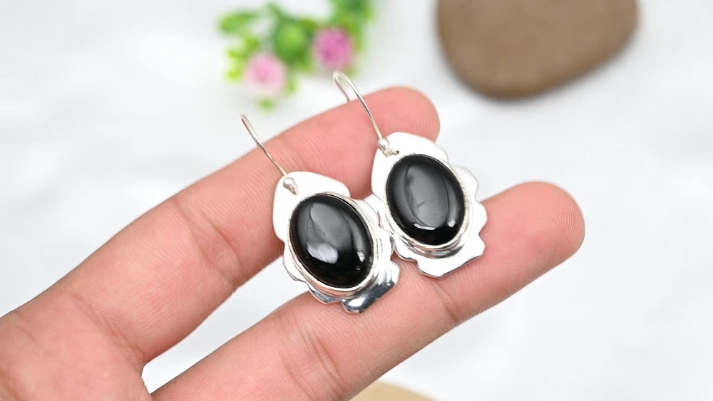 Main Stone Shape:OvalTotal Carat Weight:10 carat and aboveBase Metal:Sterling SilverDiamond Color Grade:N/AMain Stone Color:BlackColor:SilverItem Length:1.37"Main Stone:Black OnyxStyle:Dangle/DropType:EarringsDiamond Clarity Grade:N/AOccasion:Anniversary, Birthday, Christmas, Engagement, Father's Day, Mother's Day, Valentine's Day, WeddingCollection:HandmadeSeller Warranty:YesMetal:Sterling SilverMaterial:Stone, GemstoneCountry of Origin:IndiaCut Grade:ExcellentMain Stone Creation:NaturalNumber of Gemstones:2Closure:HookNumber of Diamonds:N/ATheme:Beauty, Bohemian, Ethnic, Halloween, LoveMain Stone Treatment:Not EnhancedSecondary Stone:Black OnyxBrand:HandmadeColored Diamond Intensity:N/AShape:Same As PictureMetal Purity:925Setting Style:BezelCertification:N/AEar Area:LobeCountry/Region of Manufacture:India
