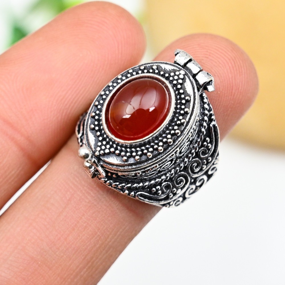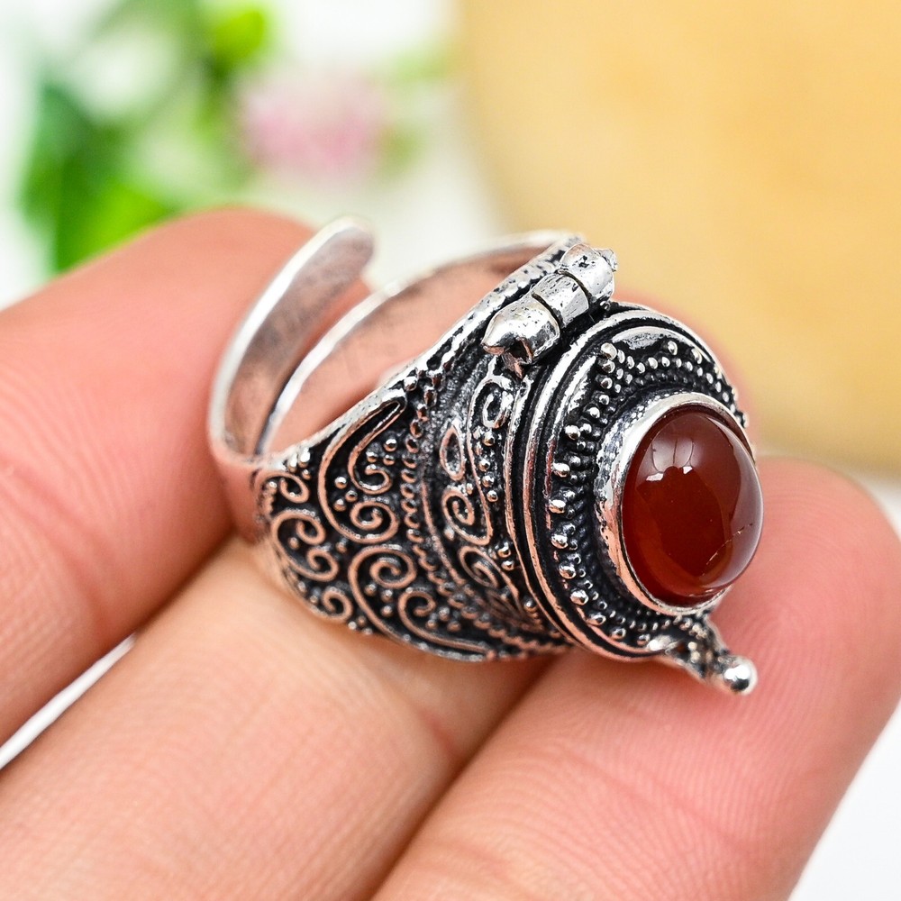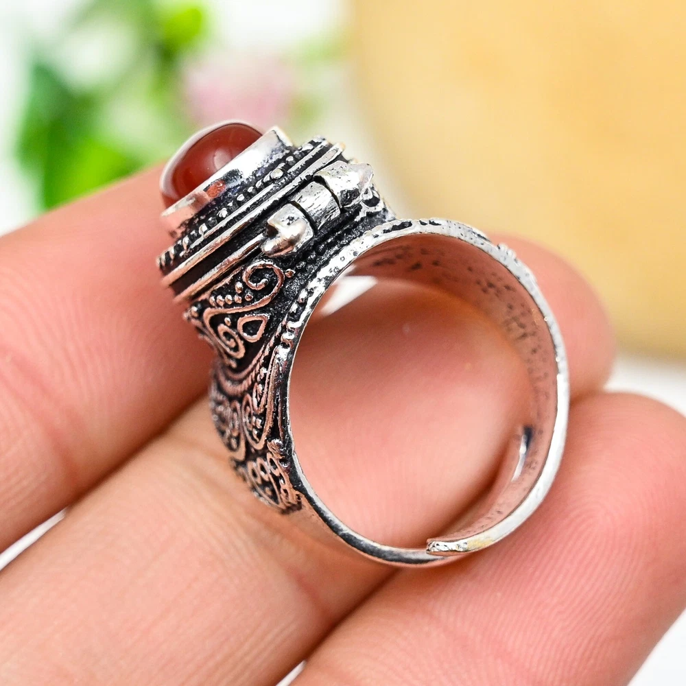 Natural Carnelian Gemstone 925 Sterling Silver Adjustable Pill Box Ring