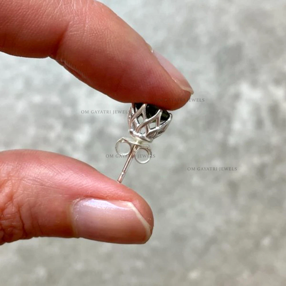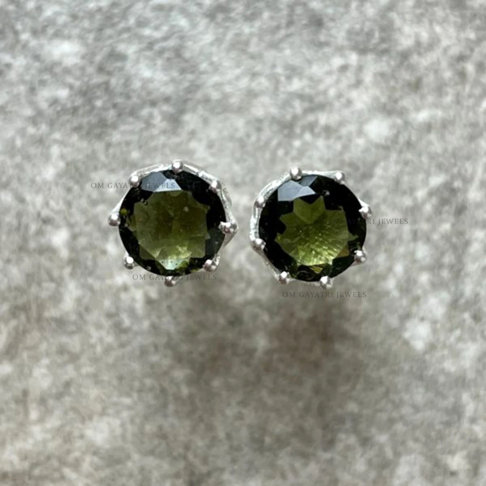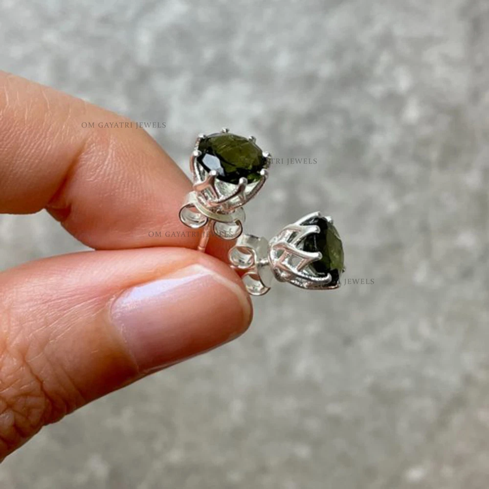Add a touch of elegance to your outfit with these beautiful Natural Czech Cut Moldavite Stud Earrings. Crafted from 925 Streling Silver, these earrings are handmade with excellent cut grade and eye clean gemstone clarity grade. The round shape of the two green gemstones with a main stone width of 7 mm and a depth of 2.5 mm make them a perfect match for any occasion, be it an engagement, wedding, anniversary, birthday, or Valentine's Day. The prong setting style and stackable feature make these earrings a unique addition to your jewelry collection. These vintage earrings with an Art Deco era (1915-1935) and a nature theme are customized to fit your style. The butterfly closure ensures a secure and comfortable fit. These earrings come with a seller warranty and are perfect for anyone who loves nature-inspired jewelry. Natural Czech Cut Moldavite Stud Earrings 925 Streling Silver Handmade Jewelry Gemstone: Moldavite Stone Shape: Round Stone Size: 7mm Stone Category: Faceted Metal: 925 Sterling Silver