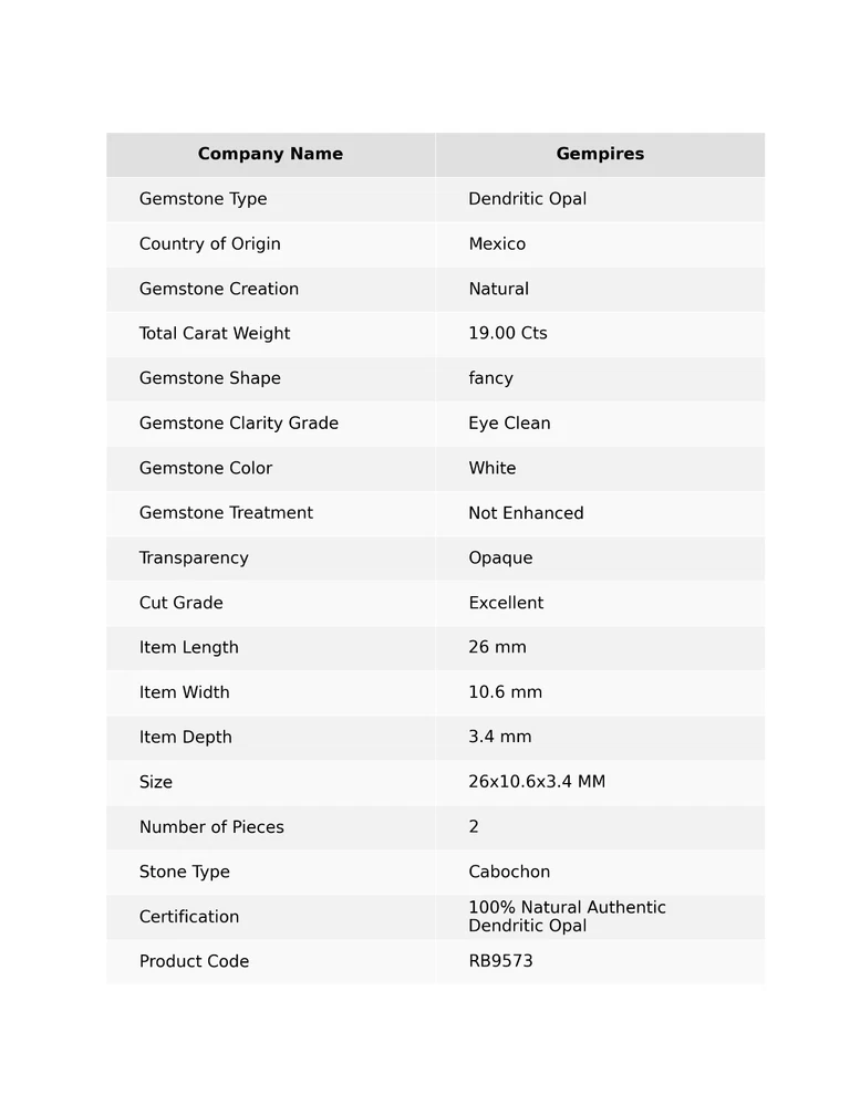 Welcome To Gempires This handmade set of two fancy-shaped Dendritic Opal gemstones from Mexico features a white color with excellent cut grade and eye-clean clarity. Measuring 26mm in length and 10.6mm in width, these natural opals are polished to perfection and have a thickness of 3.4mm. The gemstones are certified as 100% natural authentic Dendritic Opal, with no enhancements, making them a unique and transparent addition to any jewelry collection. Ideal for wholesale purchase, these opals are a rare find for those seeking quality loose gemstones for their designs. Natural Dendritic Opal Earrings Supply Cabochon 2 Pcs 19.00 Cts 26x10.6x3.4 MM Check My Other Dendritic Opal Listings : Click Here Note: For Custom / Bulk Order, Please contact on Ebay Message Service. QUALITY ASSURANCE:- The photo may not give you the actual size, please refer to the item description for size details. Our product Images are original. We dont use Photoshop for any editing. We always do our best to display an actual image of the gemstone which is to be delivered to our customers. We check all our items and ensure the best quality standards. The item weight may vary 5% (+/-) at maximum and size may vary .10 cents (+/-) as per the gemstone standard. Return Policy:- Any reason, if you are not satisfied with our product, you may return item within 14 days from the date of product delivered. The Item must be returned in its original condition. Return shipping will be paid by buyer. Shipping Policy: At Gempires, we offer two shipping options for our customers: Standard Shipping: 13-15 Days Express Shipping: 5-7 Days Standard Shipping: Our standard shipping option takes approximately 13-15 days for delivery. Please note that this is an estimated time frame and may vary depending on your location and any unforeseen circumstances. We strive to ensure that your order is processed and shipped as quickly as possible. Express Shipping: If you need your order delivered quickly, we offer an express shipping option that takes approximately 5-7 days for delivery. This option is available at an additional cost, which will be displayed during the checkout process. Please note that this time frame is an estimated delivery time and may vary depending on your location and any unforeseen circumstances. Handling Time All orders are processed and shipped within 1-2 business days after payment has been received. Once your order has been shipped, you will receive a tracking number via Ebay notifications, which you can use to track your package. Custom Duty Note Please note that we are not responsible for any customs or import duties that may be charged once the package reaches your country. These charges are the responsibility of the buyer and are not included in our shipping fees. We take great care in packaging our products to ensure that they arrive at your doorstep in pristine condition. However, if your package arrives damaged or you have any other concerns about your order, please don't hesitate to contact us. We will do our best to resolve any issues and ensure that you are satisfied with your purchase. Feedback Policy:- At Gempires, we value your feedback and strive to provide the best customer experience possible. We welcome your reviews and appreciate your time in sharing your thoughts about your purchase with us. If you are satisfied with your purchase and our service, we would love to hear about it. Your positive feedback can help other buyers make an informed decision about our products and services. If for any reason you are not completely satisfied with your purchase or our service, please reach out to us before leaving a negative review. We are committed to resolving any issues that may arise and ensuring your satisfaction. Thank you for choosing Gempires for your natural gemstone needs. Your feedback is valuable to us, and we look forward to providing you with exceptional service in the future. Best Regards Gempires
