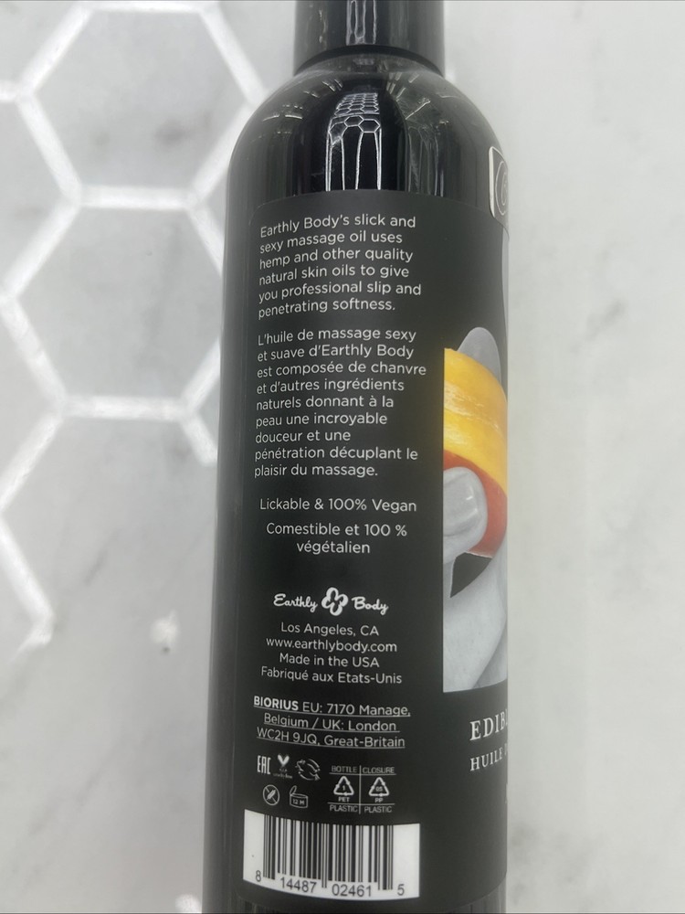 Edible Massage Oil Flavor: Mango Earthly’s Body’s Slick & Sexy Massage Oil Uses Hemp & Other Quality Natural Skin Oils To Give You Professional Slip & Penetrating Softness. Lickable & 100% Vegan 8 Fl Oz. / 237 ml