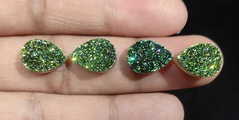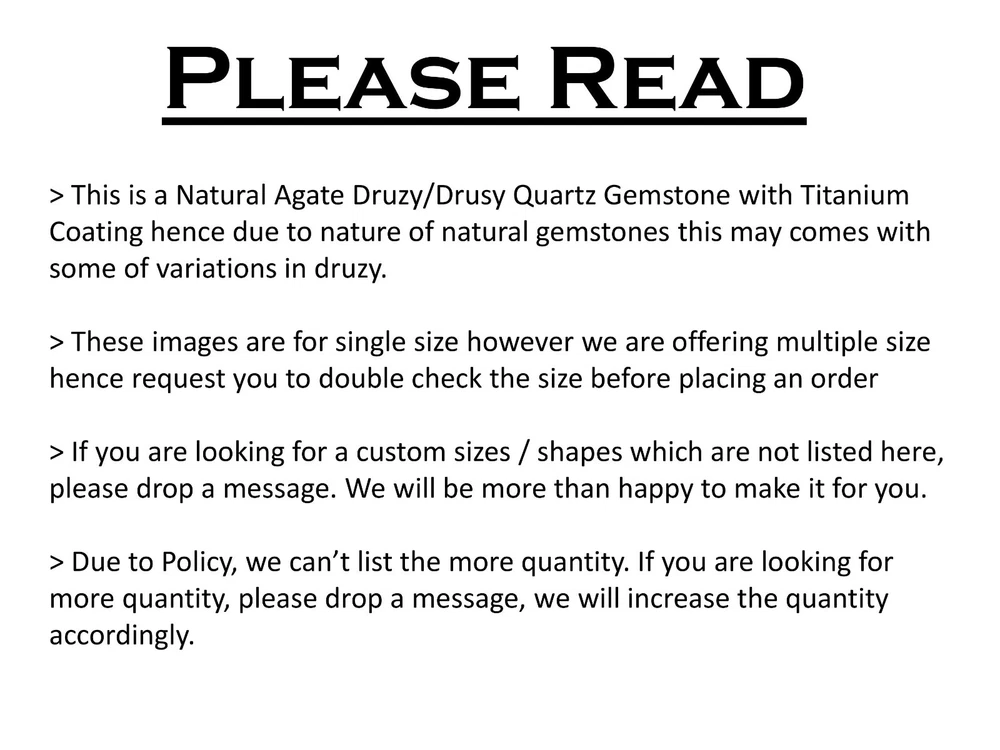 Welcome To Gempires This handmade pear-shaped Titanium Agate Druzy Quartz gemstone from India is a unique and rare find. With excellent cut grade and eye-clean clarity, this 100% natural gemstone showcases a beautiful green color and a drusy form. It is a single piece that has not been treated or enhanced, making it a stunning addition to any jewelry collection. Perfect for those seeking a wholesale purchase of authentic and transparent gemstones. Natural Titanium Agate Druzy Quartz Designer Gemstone Earrings Supply Pear Drusy Check My Other Titanium Agate Druzy Quartz Listings : Click Here Note: For Custom / Bulk Order, Please contact on Ebay Message Service. QUALITY ASSURANCE:- The photo may not give you the actual size, please refer to the item description for size details. Our product Images are original. We dont use Photoshop for any editing. We always do our best to display an actual image of the gemstone which is to be delivered to our customers. We check all our items and ensure the best quality standards. The item weight may vary 5% (+/-) at maximum and size may vary .10 cents (+/-) as per the gemstone standard. Return Policy:- Any reason, if you are not satisfied with our product, you may return item within 14 days from the date of product delivered. The Item must be returned in its original condition. Return shipping will be paid by buyer. Shipping Policy: At Gempires, we offer two shipping options for our customers: Standard Shipping: 13-15 Days Express Shipping: 5-7 Days Standard Shipping: Our standard shipping option takes approximately 13-15 days for delivery. Please note that this is an estimated time frame and may vary depending on your location and any unforeseen circumstances. We strive to ensure that your order is processed and shipped as quickly as possible. Express Shipping: If you need your order delivered quickly, we offer an express shipping option that takes approximately 5-7 days for delivery. This option is available at an additional cost, which will be displayed during the checkout process. Please note that this time frame is an estimated delivery time and may vary depending on your location and any unforeseen circumstances. Handling Time All orders are processed and shipped within 1-2 business days after payment has been received. Once your order has been shipped, you will receive a tracking number via Ebay notifications, which you can use to track your package. Custom Duty Note Please note that we are not responsible for any customs or import duties that may be charged once the package reaches your country. These charges are the responsibility of the buyer and are not included in our shipping fees. We take great care in packaging our products to ensure that they arrive at your doorstep in pristine condition. However, if your package arrives damaged or you have any other concerns about your order, please don't hesitate to contact us. We will do our best to resolve any issues and ensure that you are satisfied with your purchase. Feedback Policy:- At Gempires, we value your feedback and strive to provide the best customer experience possible. We welcome your reviews and appreciate your time in sharing your thoughts about your purchase with us. If you are satisfied with your purchase and our service, we would love to hear about it. Your positive feedback can help other buyers make an informed decision about our products and services. If for any reason you are not completely satisfied with your purchase or our service, please reach out to us before leaving a negative review. We are committed to resolving any issues that may arise and ensuring your satisfaction. Thank you for choosing Gempires for your natural gemstone needs. Your feedback is valuable to us, and we look forward to providing you with exceptional service in the future. Best Regards Gempires