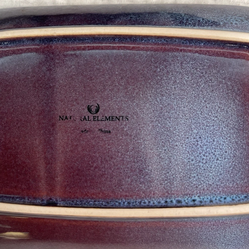 Add a touch of elegance to your dinner table with this beautiful two-piece butter dish set from Nature Elements. The rectangular stoneware dish comes with a matching lid, both in a stunning purple-blue color. This vintage art deco style piece is perfect for any occasion and is sure to impress your guests. Crafted using pottery production techniques, this butter dish set is both durable and stylish. The set includes one butter dish with lid, measuring 7.25” in length, 4.5” in width, and 3.75” in height. The backstamp is printed and the item weighs 1.9 lbs. Ideal for any nature or stoneware collection, this set is a must-have for any pottery enthusiast. Excellent condition. No chips or cracks.