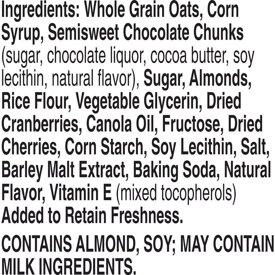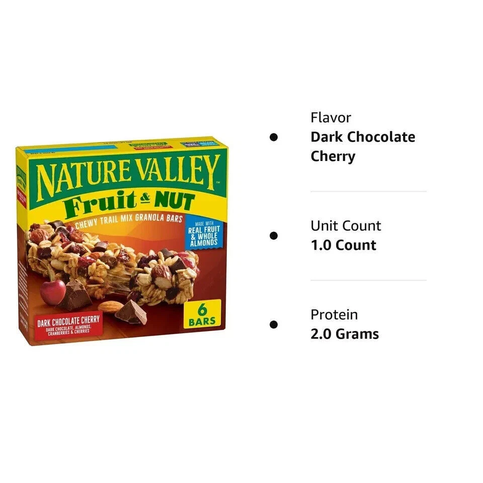 Nature Valley Fruit and Nut Granola Bars, Dark Chocolate Cherry, 6 Ct Trail mix belongs in a snack bar. Nature Valley Chewy Fruit and Nut Granola Bars are made with trail-ready whole nuts, real fruit and delicious whole grain oats. Every bite brings a combination of chewy dried cherries, cranberries, dark chocolate chunks, and crunchy almonds mixed with whole grain oats. The result is a tasty snack that's ready for the road ahead. These snack bars are perfect for the pantry, lunch box, and hiking trail. They're made with no artificial flavors, artificial colors, or high fructose corn syrup. At Nature Valley, we believe that what you put in is what you get out. So wherever the moment takes you and your family, you can rely on our great-tasting snacks to help keep you going. Contains 6 bars. Trail mix belongs in a snack bar. Nature Valley Chewy Fruit and Nut Granola Bars are made with trail-ready whole nuts, real fruit and delicious whole grain oats. Every bite brings a combination of chewy dried cherries, cranberries, dark chocolate chunks, and crunchy almonds mixed with whole grain oats. The result is a tasty snack that's ready for the road ahead. These snack bars are perfect for the pantry, lunch box, and hiking trail. They're made with no artificial flavors, artificial colors, or high fructose corn syrup. At Nature Valley, we believe that what you put in is what you get out. So wherever the moment takes you and your family, you can rely on our great-tasting snacks to help keep you going. Contains 6 bars. Nature Valley Fruit and Nut Granola Bars, Dark Chocolate Cherry, 6 Ct Trail mix belongs in a snack bar. Nature Valley Chewy Fruit and Nut Granola Bars are made with trail-ready whole nuts, real fruit and delicious whole grain oats. Every bite brings a combination of chewy dried cherries, cranberries, dark chocolate chunks, and crunchy almonds mixed with whole grain oats. The result is a tasty snack that's ready for the road ahead. These snack bars are perfect for the pantry, lunch box, and hiking trail. They're made with no artificial flavors, artificial colors, or high fructose corn syrup. At Nature Valley, we believe that what you put in is what you get out. So wherever the moment takes you and your family, you can rely on our great-tasting snacks to help keep you going. Contains 6 bars. Trail mix belongs in a snack bar. Nature Valley Chewy Fruit and Nut Granola Bars are made with trail-ready whole nuts, real fruit and delicious whole grain oats. Every bite brings a combination of chewy dried cherries, cranberries, dark chocolate chunks, and crunchy almonds mixed with whole grain oats. The result is a tasty snack that's ready for the road ahead. These snack bars are perfect for the pantry, lunch box, and hiking trail. They're made with no artificial flavors, artificial colors, or high fructose corn syrup. At Nature Valley, we believe that what you put in is what you get out. So wherever the moment takes you and your family, you can rely on our great-tasting snacks to help keep you going. Contains 6 bars.