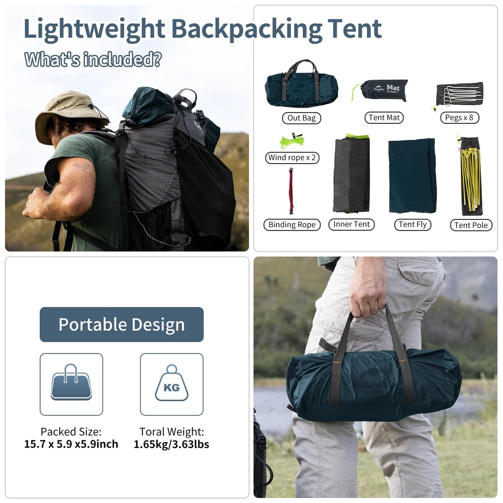 Naturehike Bikepacking 1 Person Tent, Waterproof Easy Set up Free Standing Single Person Tent, Lightweight Backpacking Tent for 1 Person, One Person Tent with Footprint Included Product Details Color: 20D Navy Blue Brand: Naturehike MPN: J0-KJYN-7P44 EAN: 6927595705889 UPC: Does not apply Brand: Naturehike Product Dimensions: 80.7"L x 61"W x 43.3"H Item Weight: 3.7 Pounds Floor Width: 12 Inches Recommended Uses For Product: Backpacking, Trekking, Camping & Hiking, Mountaineering, Fishing Shape: dome tent Occupancy: 1 Person Seasons: 3 Season Included Components: Carry Bag, Peg, Rope Water Resistance Technology: 4000 Mm Brand: Naturehike Product Dimensions: 80.7"L x 61"W x 43.3"H Item Weight: 3.7 Pounds Floor Width: 12 Inches Recommended Uses For Product: Backpacking, Trekking, Camping & Hiking, Mountaineering, Fishing Shape: dome tent Occupancy: 1 Person Seasons: 3 Season Included Components: Carry Bag, Peg, Rope Water Resistance Technology: 4000 Mm Special Feature: Portable, Ultralight, Waterproof, Lightweight, UVProtection, Rainfly Occupant Capacity: 1 Design: Camping Tent Material: Nylon Color: 20D Navy Blue Sport: Camping & Hiking Age Range (Description): Adult Installation Type: Easy Setup, Instant, Free Standing Product Care Instructions: Hand Wash Assembly Time: 2 minutes Pole Material Type: Aluminum Size: 1 person Closure Type: Zipper Number of Doors: 1 Fabric Type: Rainfly: 20D silicone coated nylon(Waterproof PU 4000mm), Inner Tent: 210T rip-stop polyester+B3 breathable mesh(Waterproof PU 3000mm), Floor: 150D rip-stop oxford(Waterproof PU 3000mm), Poles: 7001 Aluminum alloy Floor Length: 80.7 Inches Maximum Height: 43.3 Inches Base Material: Polyester Number Of Poles: 2 Style: Three-season Water Resistance Level: Waterproof Assembly Required: Yes Stake Material: Aluminum Number of Vestibules: 1 Number of Guylines: 1 Is Waterproof: True Model Name: Naturehike Cycling 1 Person Tent Manufacturer: Naturehike Item Package Dimensions L x W x H: 15.79 x 9.49 x 5.39 inches Package Weight: 1.74 Kilograms Item Dimensions LxWxH: 80.7 x 61 x 43.3 inches Brand Name: Naturehike Suggested Users: unisex-adult Part Number: J0-KJYN-7P44 Date First Available: January 14, 2022 Rainfly: 20D silicone coated nylon(Waterproof PU 4000mm) Waterproof & Windproof:Made of PU4000mm waterproof 20D nylon with silicone coating, and all corners and seams are taped, keeps you dry , with no leaks or drops of water inside. The 7001 aluminum alloy is tough and durable, hold up firmly in heavy wind and rainstorm. Enjoy a good nights sleep regardless of the weather, go through hail and tons of rain and wind with the tent. Roomy 1 person Tent for 3 Seasons:Tent Dimensions : 80.7 (L) x (12+37.4+12)(W) x 43.3 (H) inches. This one person tent has height of 43.3inch, plenty room for a single person to sleep and enough headroom to sit down inside comfortably. Easy setup Freestanding Tent: Super easy to assemble, free-standing design with 2-Y aluminum alloy poles, it takes less than 5 minutes to set up the tent for anyone with no experience. Good Ventilation Double Layer Tent:This tent is designed with two layers, which helps to create as much space and airflow between the fly and the inner tent. High desity B3 mesh inner tent and the window provide good ventilation and much air flow inside the tent. D-shaped mesh door with smooth two-way zippers provide much better ventilation and easy access to the tent. Ultralight Single Person Tent:Made of lightweight 20D nylon material, this ultralight single person tent only weighs 3.63lbs. Small packed size:15.7 x 5.9 x 5.9 inch,save room for other camping gears, this solo tent is perfect for lightweight backpacking, bikepacking, motorcycle camping, hiking, cycling,fishing,etc. FOOTPRINT INCLUDED:This backpacking tent comes with the footprint for the tent, you dont need to purchase separately. Package also included: Tent x1, Rainfly x1, Aluminum Pole x1, Reinforced Pegs x8, Reflective Wind Ropes x2, Carry Bag x1.