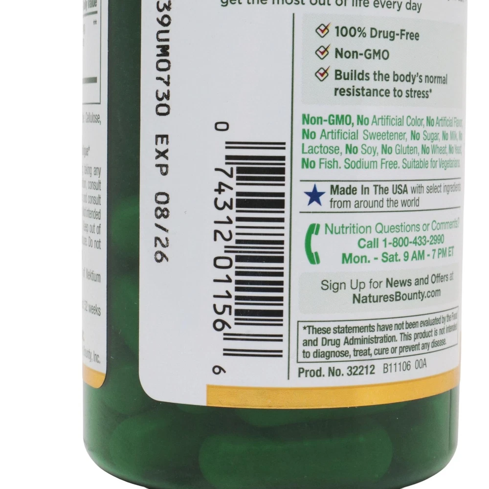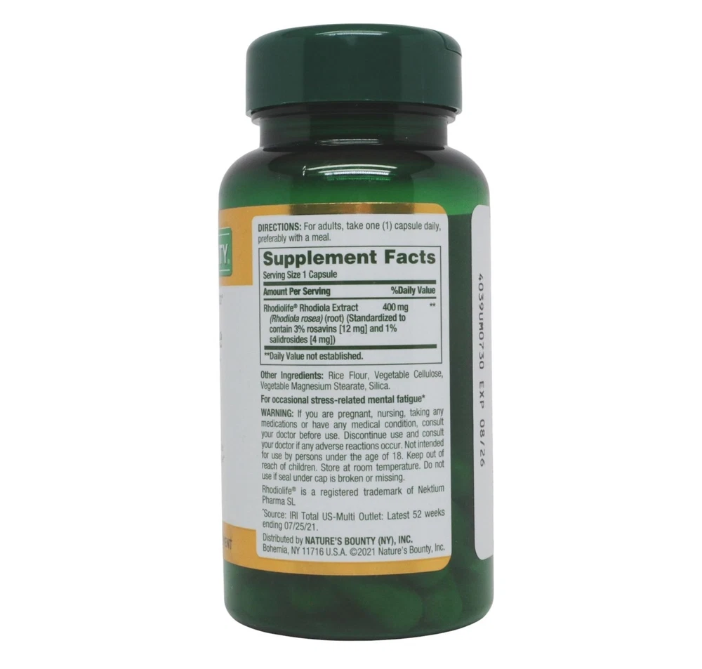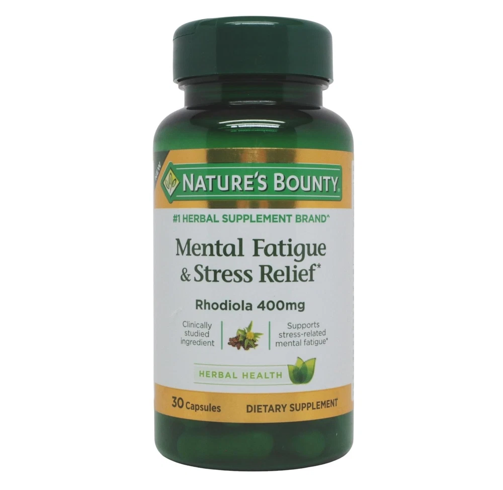 Nature's Bounty Mental Fatigue & Stress Relief Rhodiola 400mg Herbal Health 30ct Nature's Bounty Mental Fatigue & Stress Relief Rhodiola 400mg Herbal Health 30ct Features STRESS AND MENTAL FATIGUE SUPPORT: Natures Bounty Mental Fatigue & Stress Relief capsules help support occasional stress-related mental fatigue, such as the kind you get when studying hard for an exam or working long hours (1) BUILDS BODYS RESISTANCE TO STRESS: Natures Bounty Mental Fatigue & Stress Relief builds the body's normal resistance to occasional stress and helps support your ability to stay calm (1) 400 MG OF RHODIOLIFE: Natures Bounty Mental Fatigue & Stress Relief contains 400 mg of clinically studied ingredient Rhodiola for stress support. Rhodiola root is an adaptogen thats been used for centuries to relieve stress and reduce fatigue. (1) CONVENIENT CAPSULE: Convenient 1-per-day capsule makes it easy to include Natures Bounty Mental Fatigue & Stress Relief into your daily routine. UNSURPASSED QUALITY AND VALUE: Using the latest breakthroughs in nutritional science and the finest ingredients, Natures Bounty provides supplements of unsurpassed quality and value Details Item Weight: 0.11 pounds Shipping Weight: 0.11 pounds Item model number: 032212 Item MPN: 032212 Item part number: 032212 Fast & Free Shipping Orders are shipped out within 2-3 business days usually and delivered to your doorstep as quickly as possible. Competitive Pricing Our competitive prices are some of the lowest that you will find on the internet. Rest assured that you're getting a good deal when purchasing from us. 30-day Money Back Guarantee We are committed to making sure that you leave this transaction satisfied. If you're unhappy with the product for any reason, you may return it back for your money-back or a replacement if available within 30 days.