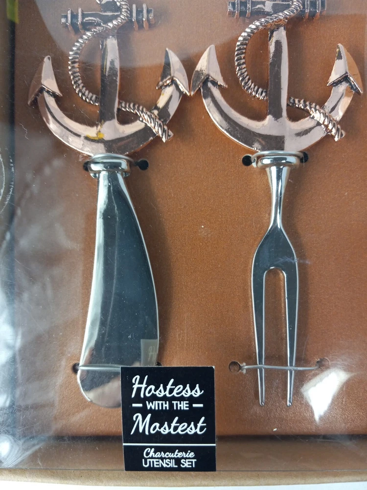 Nautical Hostess with the Mostess Copper toned Anchor Charcuterie Knife and Fork Utensil Set 4.5 inch. See pictures for measurements. PLEASE NOTE: plastic cover has some dents, see pictures. Will combine shipping on multiple orders. Shipped from smoke free environment. Fast shipper!