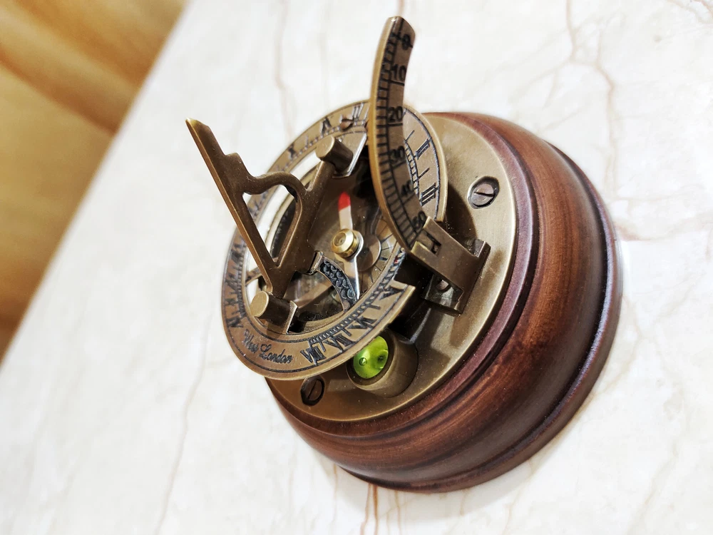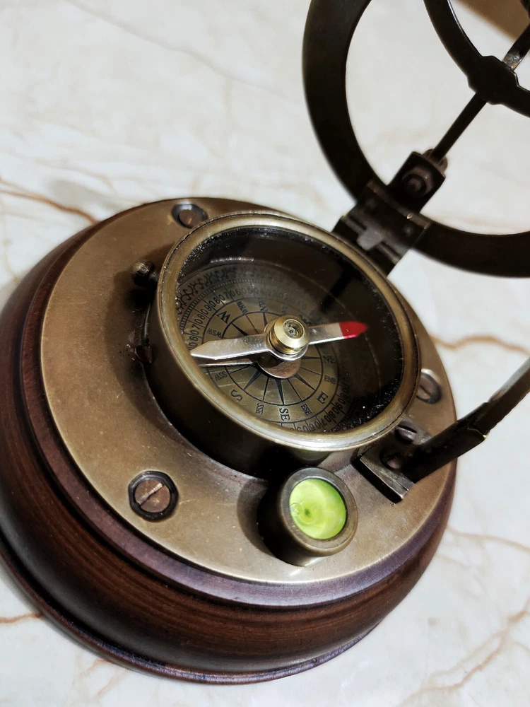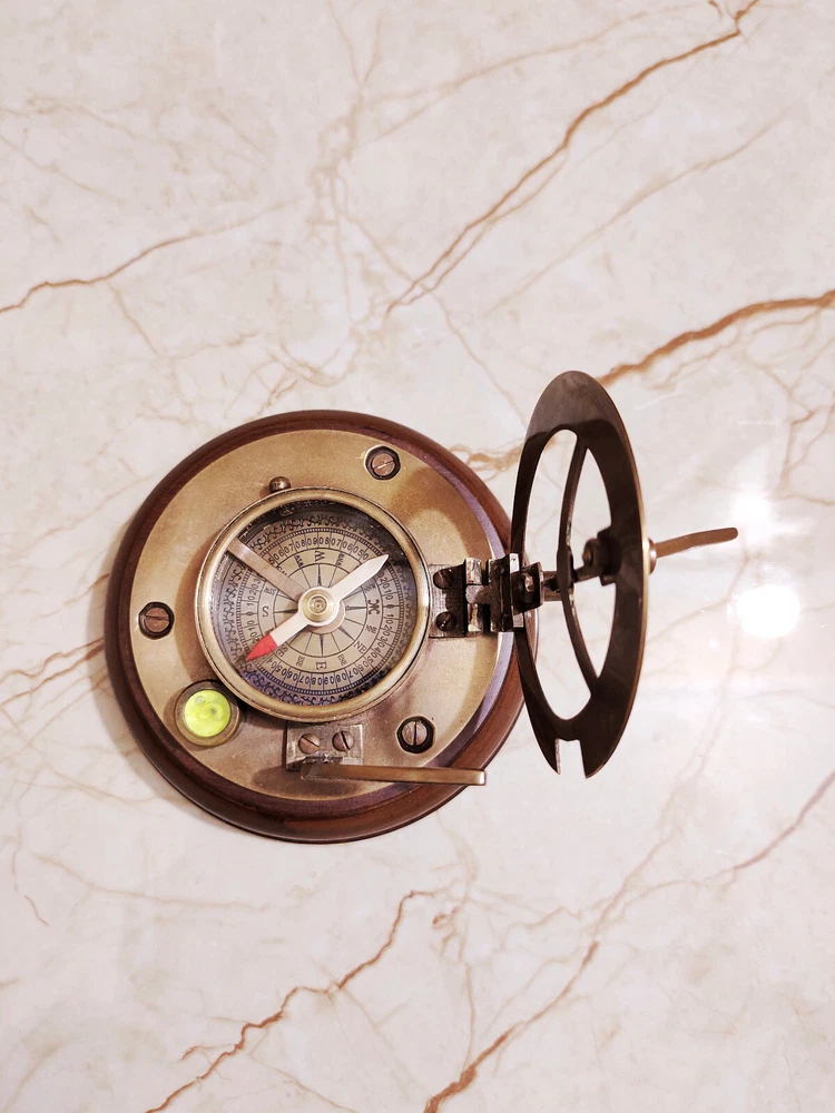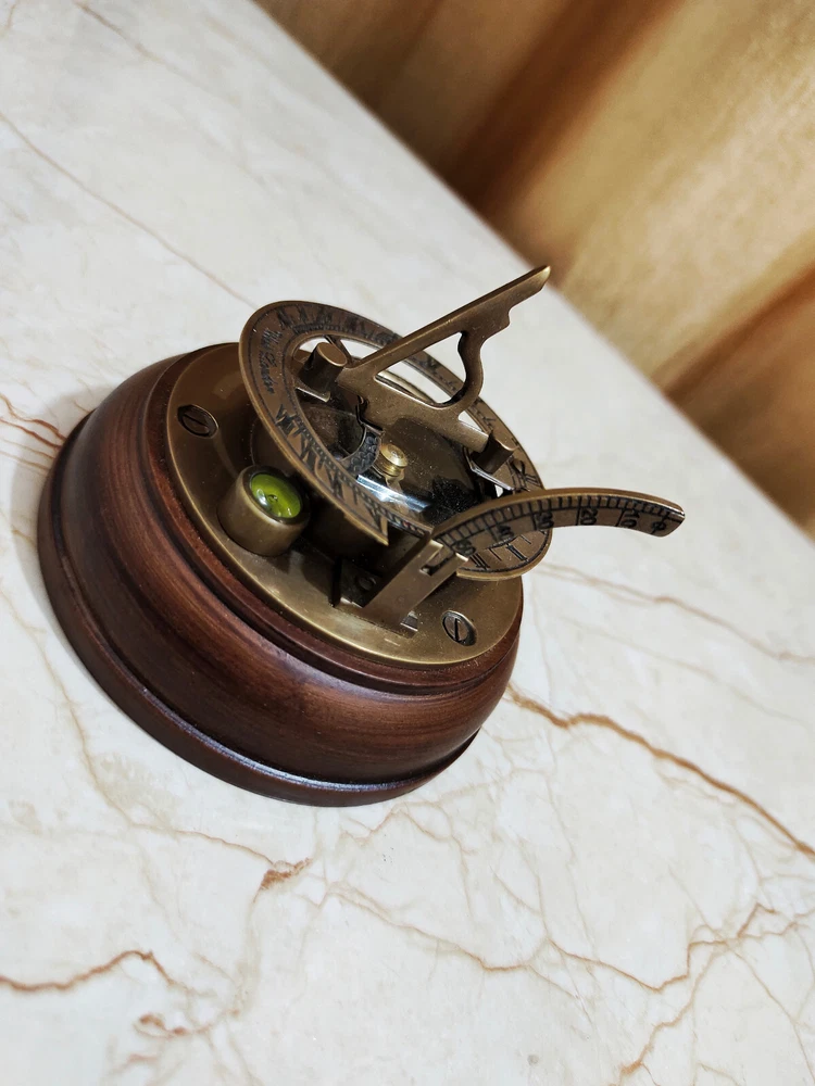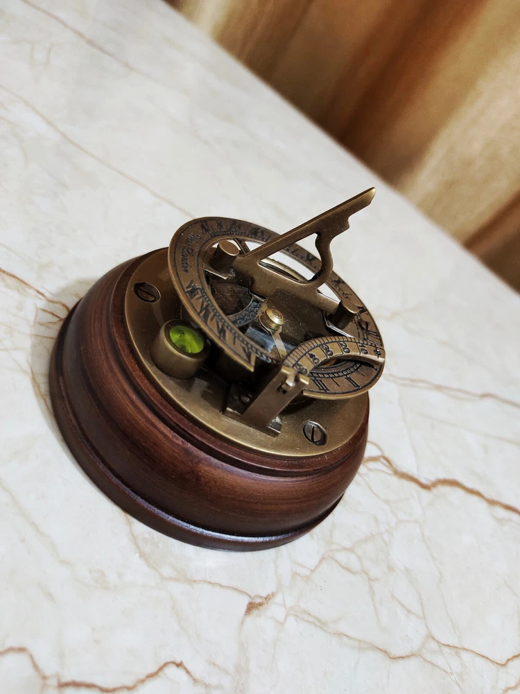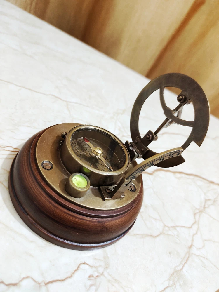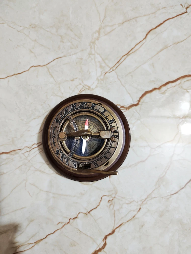 Introduce a slice of maritime elegance to your decor with this exquisite Marine Brass Sundial Compass. Meticulously crafted from high-quality brass with a stunning antique finish, this classic piece rests elegantly on a polished wooden base, combining functionality and aesthetic appeal. Not just a navigation tool, this sundial compass doubles as a decorative paperweight or a striking desk ornament. Measuring 3 inches in diameter, its robust brass construction promises longevity, while the refined wooden base enhances its overall charm. This unique compass makes a perfect gift for occasions like Father’s Day, anniversaries, or for any special dad, delighting those who admire nautical themes and vintage treasures. Ideal for enhancing your tabletop decor, this artisanal compass is a fabulous addition to any collection. It also serves as a thoughtful present for boys, executives, or anyone who values exquisite craftsmanship. Elevate your space with this one-of-a-kind piece that effortlessly marries history and elegance. Product Highlights: Handcrafted from solid brass with a polished wooden base Functional sundial compass for navigation or decorative purposes Dimensions: Compass diameter 3 inches (7.62 cm) Weight: 300 grams (0.66 lb) Ideal for gifting on special occasions such as Father's Day , anniversaries , or Christmas Enhance your decor or delight a loved one with this beautifully crafted nautical compass , perfect for desk display or as a unique anniversary gift .