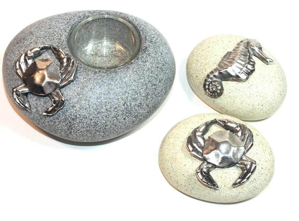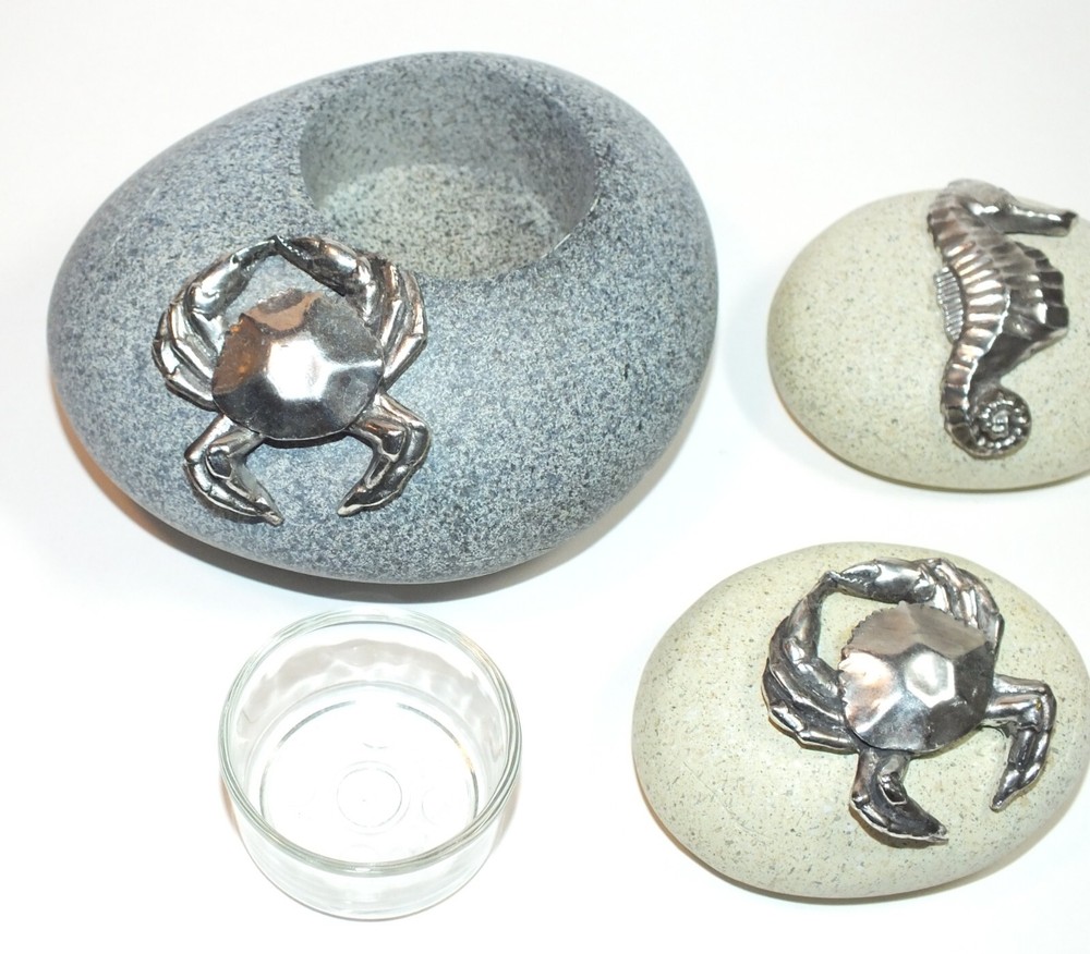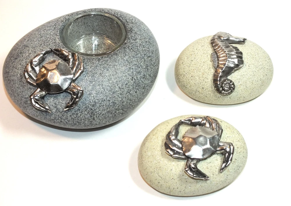 Home Decor Beach Nautical Themed Tealight Candle Holder Crab Accents Seahorse 3 Faux Rocks. One is a tealight candle holder. 2 are just decorative rocks with metal charm accents. The faux rocks are made out of some type of resin material, sturdy but not the same weight of natural rocks. The big rock measures 4.5" x 3.5". The smaller rocks measures 3" x 2". Shipping and handling is USPS ground advantage shipping with delivery confirmation. If you are interested in more then one of my "buy it now" auctions, I will do my best to offer a reasonable combined shipping discount. I charge close to actual shipping cost as I can. Since the size of the products I sell are varied, I won't know the cost of shipping orders together until the auctions have ended. If you buy more then one item, please do not pay until you have received a combined invoice from me. I will do my best to combine items with a reasonable shipping charge unless the items are too large or awkward to ship together.
