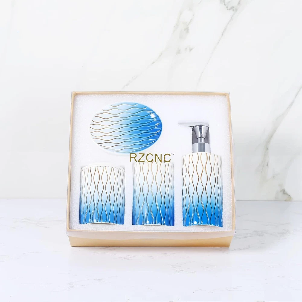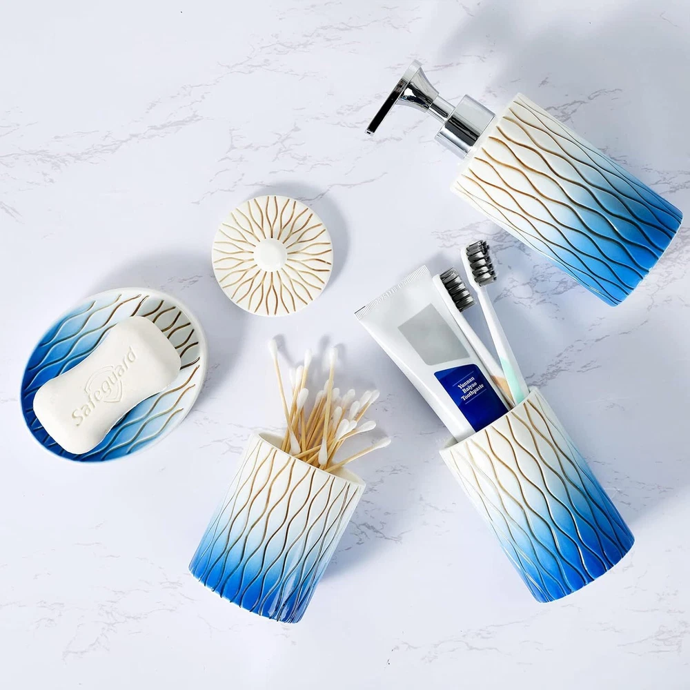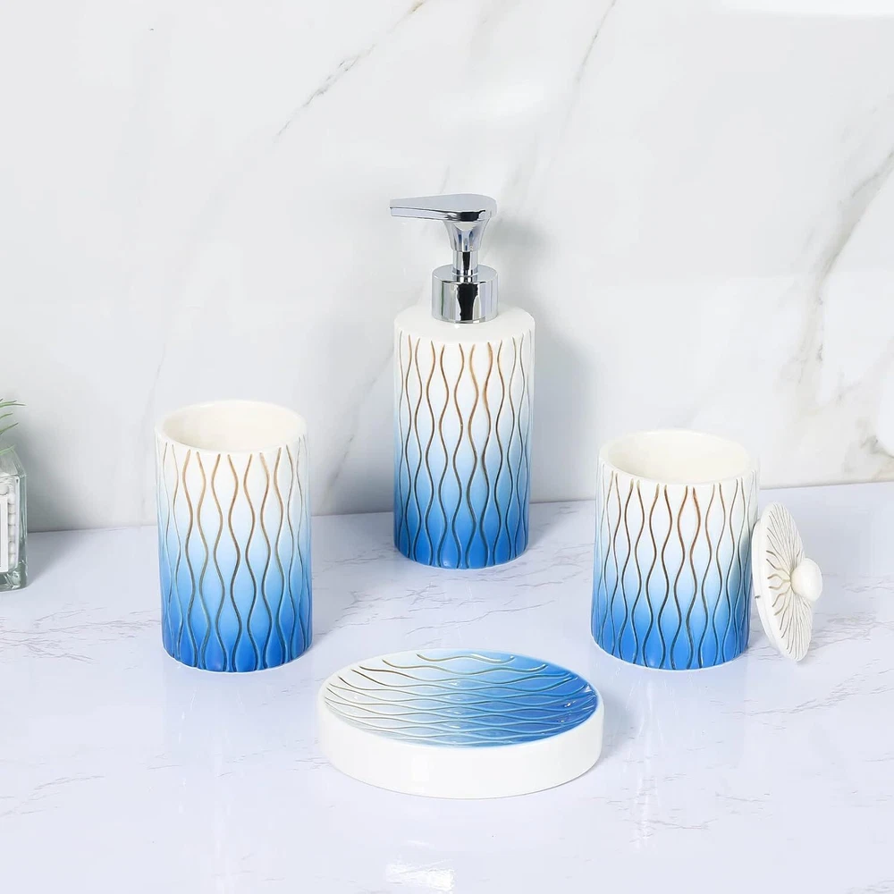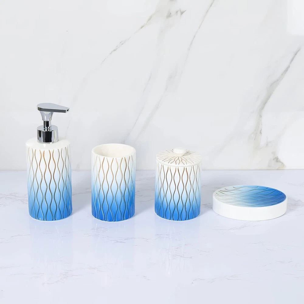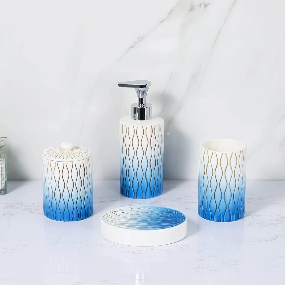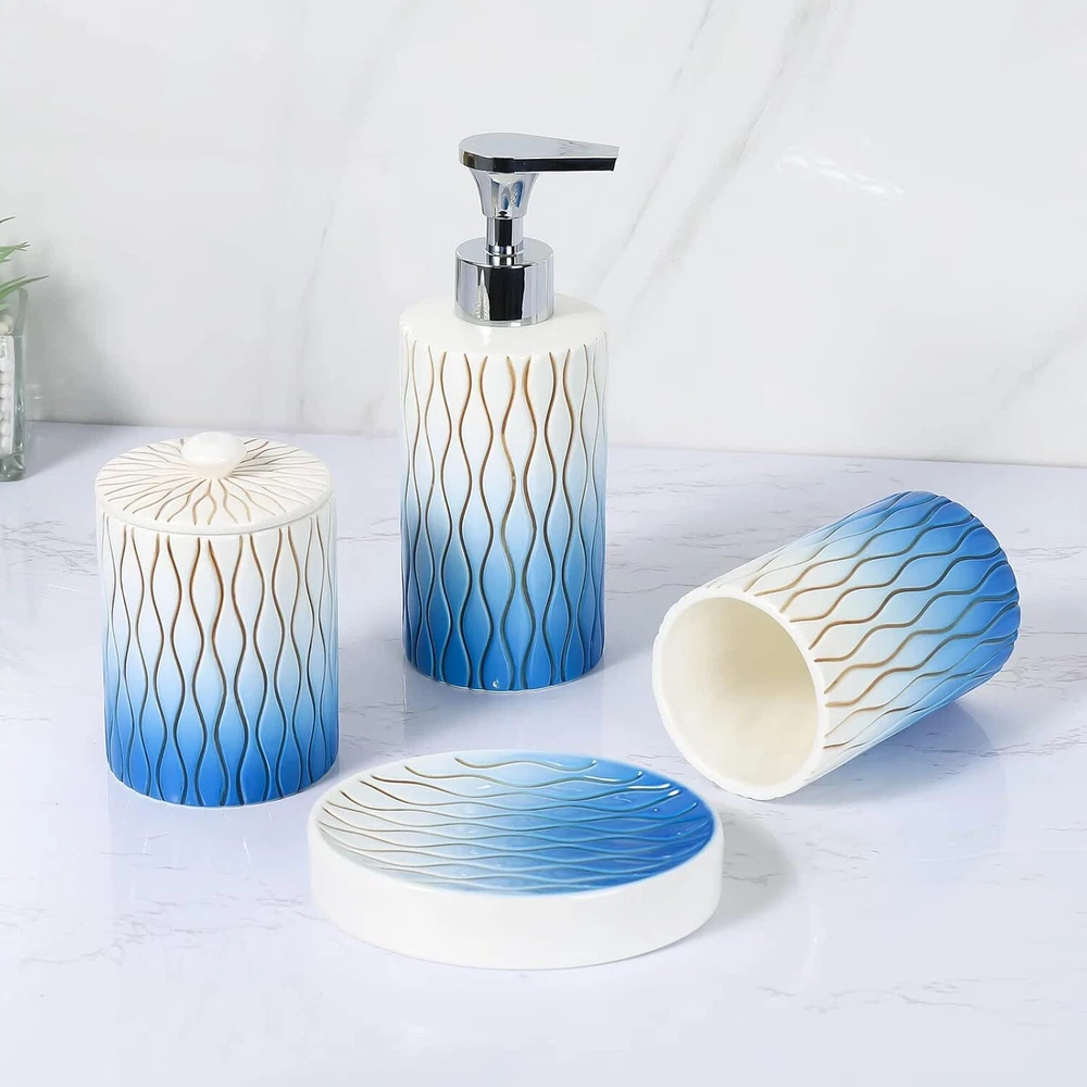 Navy Blue Bathroom Accessories Set,Hand-carved Lines Ceramic C-blue Product Details Number of Pieces: 4 Finish Type: Painted Manufacturer: RZCNC Package Dimensions: 10.51 x 9.76 x 4.09 inches Item Weight: 3.07 pounds Item model number: 68220019 Fabric Type: Ceramic Finish types: Painted Batteries required: No Material: Ceramic Color: C-blue Brand: RZCNC Style: Modern Included Components: Toothbrush Holder Ceramic Premium Bathroom Accessories Set : 4-piece bathroom set for keeping everyday essentials neatly organized and easy to access. Well Made :Made of premium-quality ceramic ,it has no chemical smell . Very solid and sturdy. Hand Engraved:Each line is engraved and painted by hand on the surface.It will not fade with time and the paint will not peel off after normal daily use. Big Soap Pump :Easy-to-use big press head dispensing ,which Is Strong enough to dispense the needed amount of liquid easily. Nice GIFT Choice - Beautiful look and functional design makes our bathroom accessories set a great gift for housewarming, wedding, birthday, Thanksgiving Day, or anniversary.