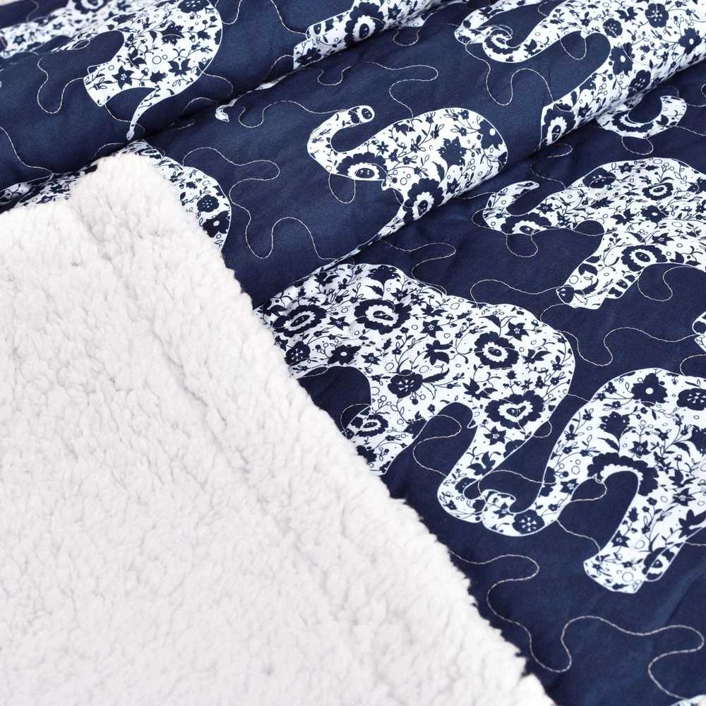 Navy Elephant Parade Throw Fuzzy Reversible Sherpa Blanket 60” x 50 White