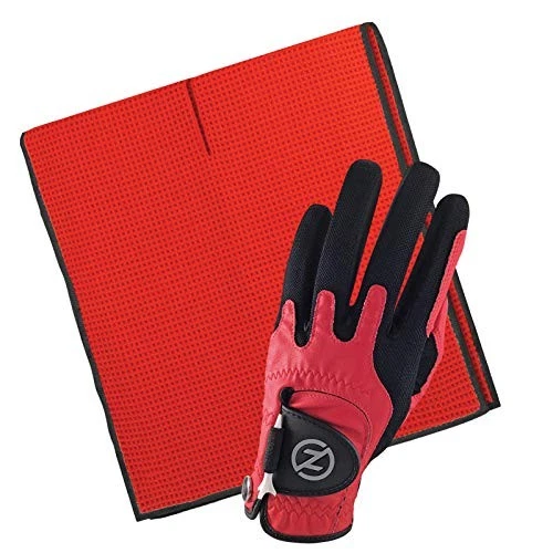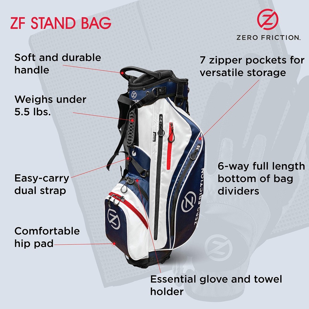 7 zipper pockets for versatile storage: apparel compartment, lined valuables pocket and insulated water bottle pocket Essential accessories holders: includes glove and towel holder, scorecard and pen holders, and umbrella holder 6 way full length, bottom of bag dividers to keep your clubs organized and prevent shafts from crossing Easy carry features: Comfortable hip pad, extremly lightweight at under 5.5 lbs, matching rain hood Includes a bonus 40" golf towel and universal-fit men's left hand golf glove