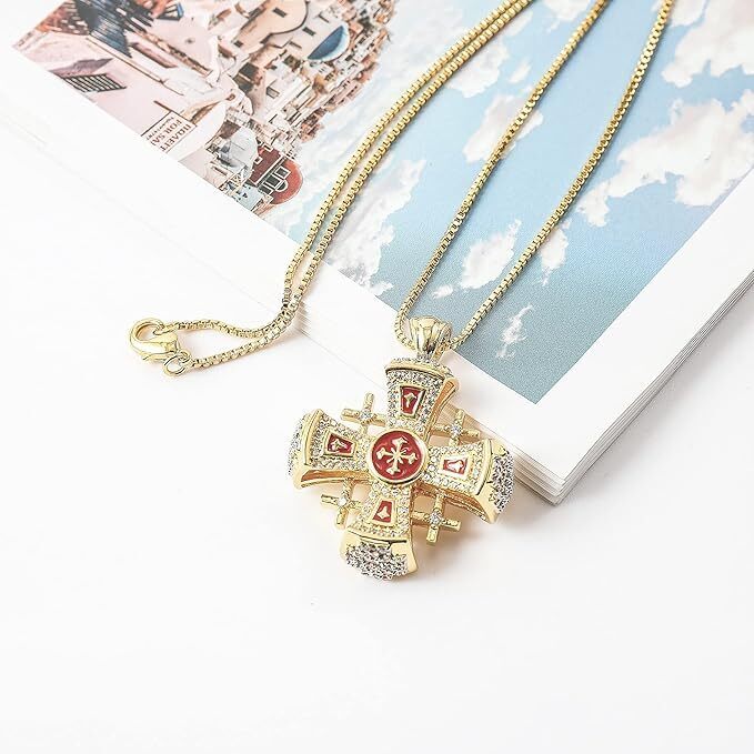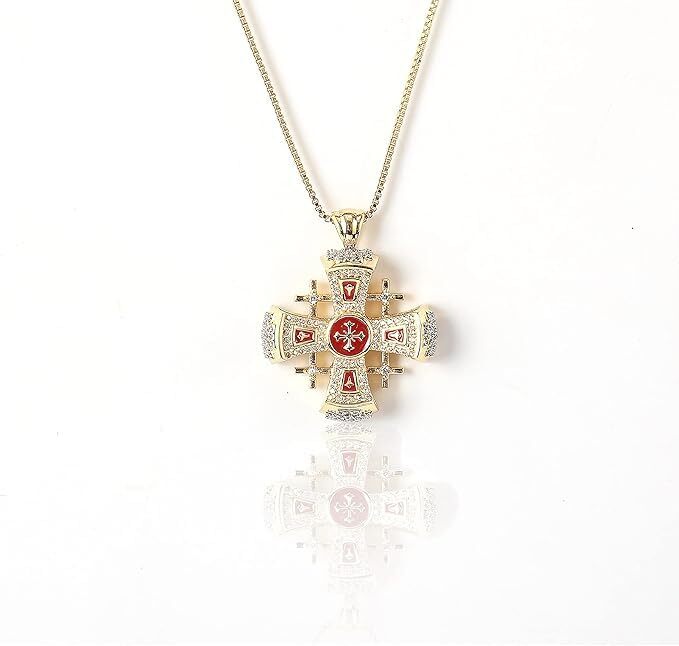 This stunning Jerusalem Cross pendant is a true masterpiece! The 18k gold plating over silver gives it a luxurious look, while the vibrant red enamel and sparkling rhinestones add a bold, elegant touch. It’s lightweight yet durable, hypoallergenic, and tarnish-resistant—perfect for daily wear. The craftsmanship is exceptional, making it feel like a high-end piece without the hefty price tag. Whether for faith or fashion, this necklace is a gorgeous statement piece that turns heads. Absolutely love it!