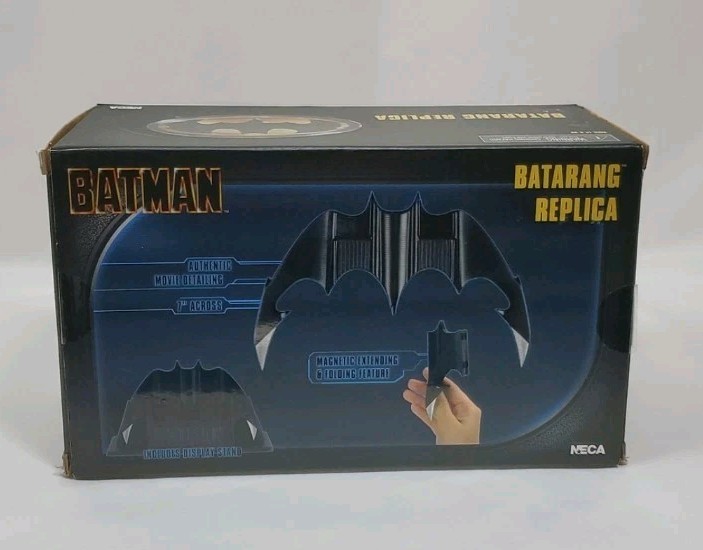 Open box See pictures of actual item listed. Cross Listed. NECA - Batman 1989 Batarang Prop Replica 🦇From NECAs DC Prop Replica line is this The Batarang from the 1989 Batman film. 🦇The Batarang measures 7″ long with articulated hinges and magnets, allowing it to open and close. 🦇Also included is a display base for exhibiting in your own personal Bat Cave. 🦇Great gift for the Batman fan in your life.
