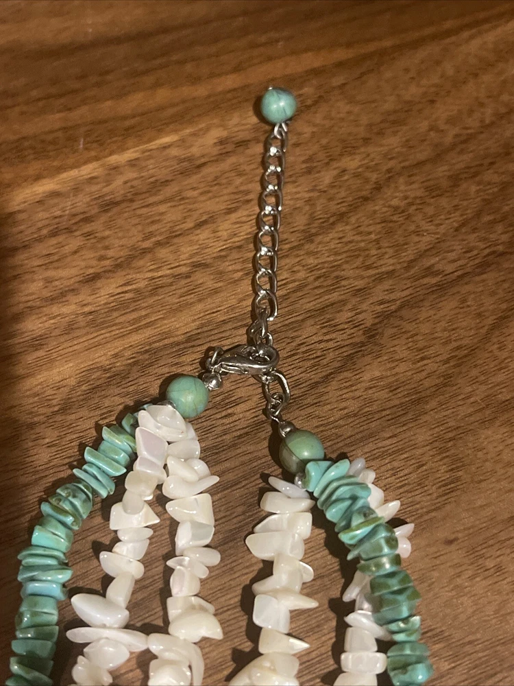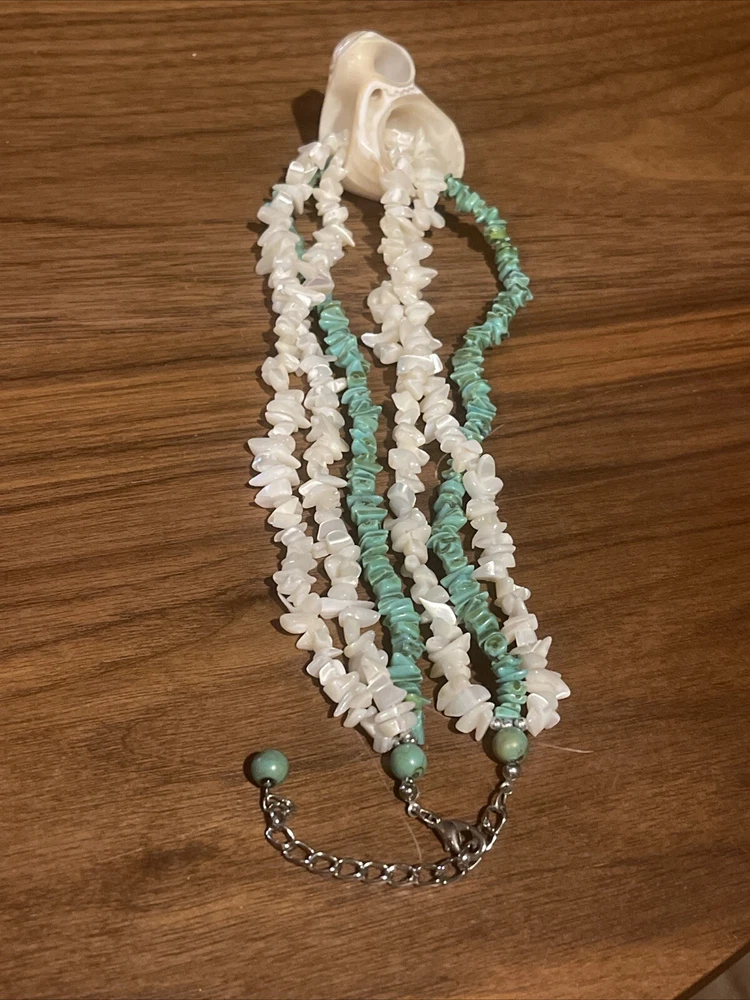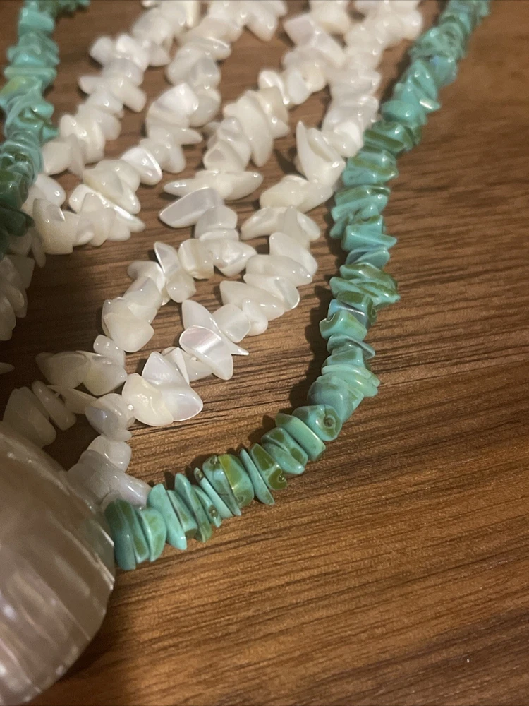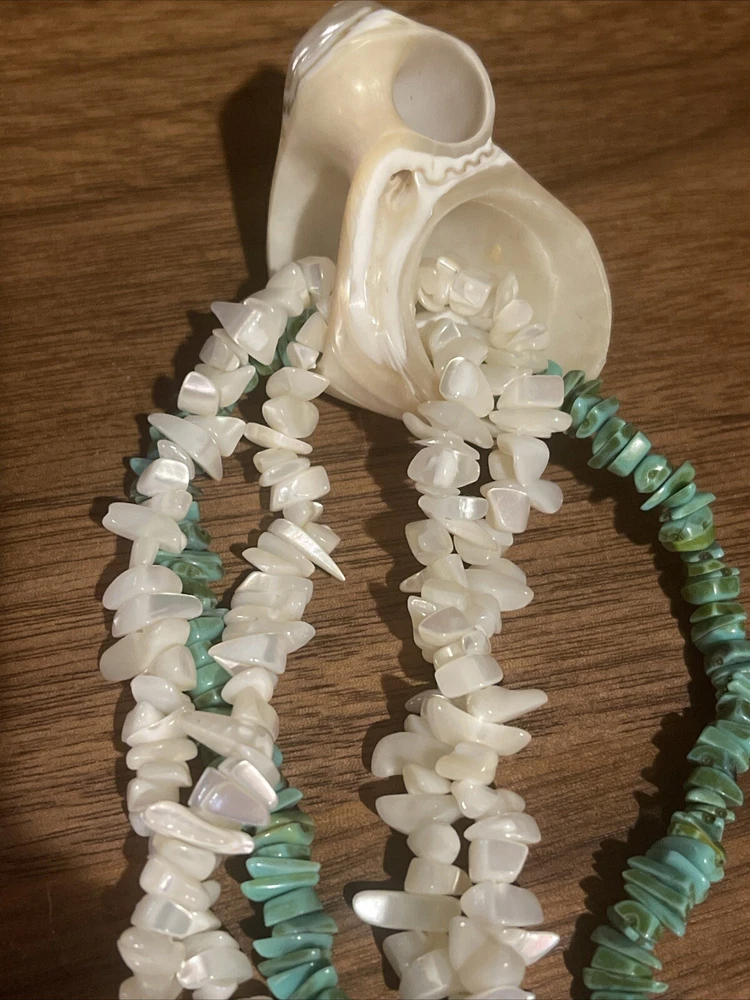 This vintage necklace is a stunning piece of jewelry that features a beautiful white mother of pearl shell and tumbled puka shells. The necklace is 18 inches long and has a large shell pendant with white and blue beaded style that adds to its overall elegance. The shell material gives the necklace a unique and organic feel that is sure to catch the eye of anyone who sees it. This necklace is perfect for those who appreciate vintage and antique jewelry and want to add a touch of nature to their style. I don’t believe the blue is turquoise.