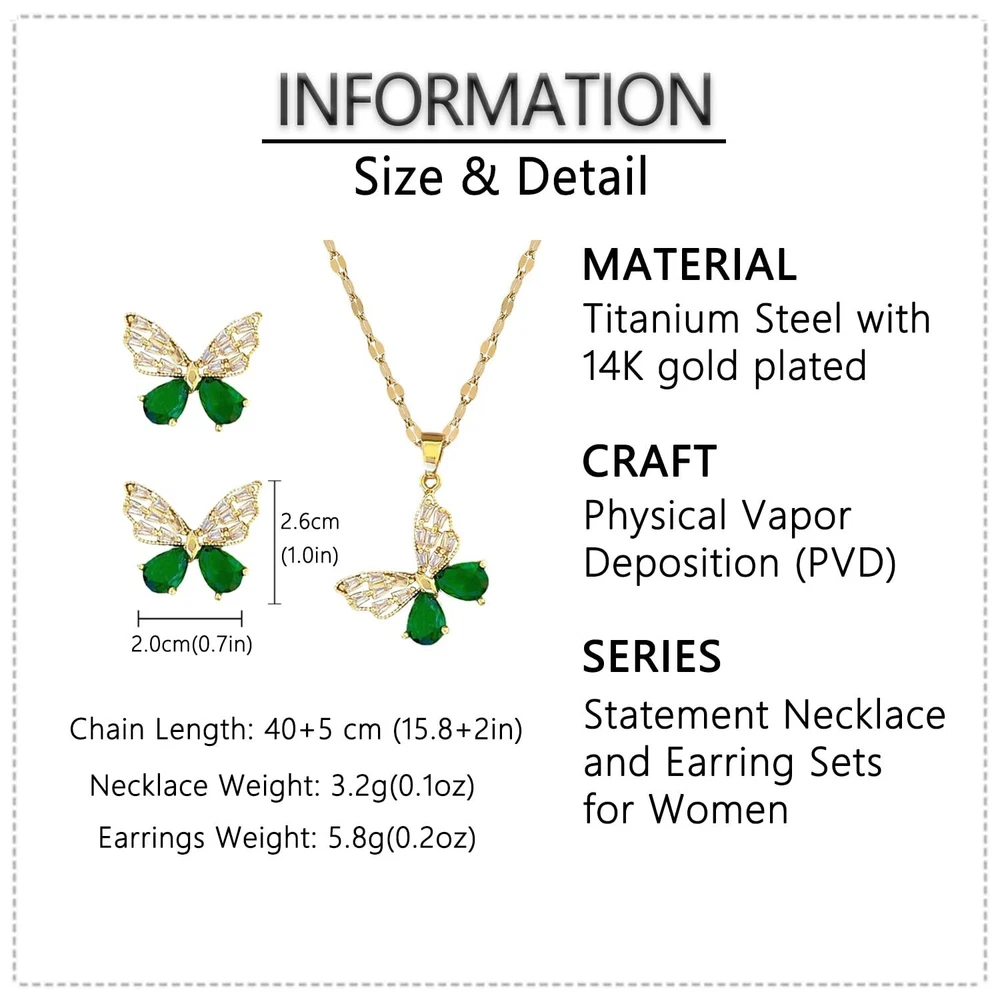 Necklace and Earring Sets for Women 14K Gold Plated Dainty Pearl Geometric Heart Rose Flower Rhinestone Charms Choker Earrings Statement Bridal Wedding Jewelry Set Product Details Color: Green Wing Butterfly Brand: YURAOER MPN: Does not apply UPC: Does not apply EAN: Does not apply Product Dimensions ‏ : ‎ 1.97 x 1.97 x 0.39 inches; 1.06 ounces Department ‏ : ‎ womens Date First Available ‏ : ‎ June 6, 2024 Manufacturer ‏ : ‎ YURAOER JEWELRY Brand, Seller, or Collection Name: YURAOER Material: Titanium Stainless Steel Gem Type: Rhinestone Setting: Pave Setting Item Length: 1.97 inches Chain: Curb Clasp: Lobster Clasp Number of stones: 4 Metal: Titanium Steel Metal stamp: No Stamp Metal Weight: 5 g Stone shape: Heart Minimum color: Clear/Colorless Exquisite Necklace and Earring Jewelry Set Elevate your style with this exquisite necklace and earring set, a perfect blend of elegance and charm. Crafted with 14K gold plating, these dainty yet eye-catching pieces feature a stunning array of designs, from delicate pearls and geometric hearts to intricate rose flowers and sparkling rhinestones. The choker necklace adds a touch of whimsy with its bowknot charm, while the statement earrings command attention with their bold and beautiful presence. Whether you're dressing up for a special occasion or simply want to add a touch of glamour to your everyday look, this set is sure to become a treasured addition to your jewelry collection. Suitable for women alike, it makes an ideal gift for weddings, bridal parties, or any celebration of love and style. About our Warranty Service We always spare no efforts to develop high-quality and stylish jewels and offer best services. We guarantee 90 days money back for any reason if you don't satisfied with this items.