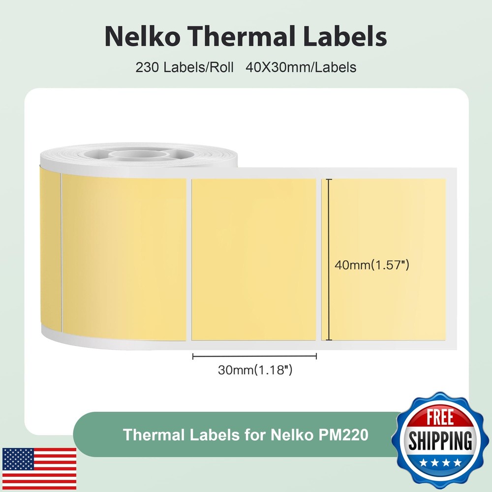 Nelko Thermal Labels for PM220, 1.57'' x 1.18'' (40x30mm), 230 Self-Adhesive Thermal Paper, Yellow, Waterproof, Multi-Purpose, No BPA and BPS Features Specifications- Label Size: 1.57"x1.18" (40x30mm). Quantity: 1 Rolls, 230 labels. Color: Yellow. Genuine themal label tape compatible with Nelko PM220 label maker, it may not work on other label makers Notice- Label Maker Tape on the side of the roll is compatible with the Nelko PM220 Label Maker, as it contains a printing sensor chip for RFID identification. Please avoid tearing or damaging the sticker, as this may impact the printing quality No-BPA& BPS- NELKO aims to offer products that meet your printing requirements, with the assurance that these thermal labels have no BPA and BPS. No need for ink toner or ribbons, saving you money and giving you one less thing to worry about Good Quality- This thermal label uses the highest quality materials, adhesives, and topcoat to achieve the best quality. The label contains a high-performance adhesive layer that can adhere to almost all surfaces. With strong adhesion, wear resistance, temperature resistance, waterproofing, oil resistance, and tear resistance, you can confidently apply it to your business and home Widely Use- Nelko Thermal Label is dedicated to fulfilling various printing requirements for customers. Enjoy labels anywhere like small businesses: clothing, crafts, retail, jewelry, etc. Label address, barcode, transportation, price, date, ingredients, and product labeling. They are perfect for different occasions like Christmas, Halloween, Thanksgiving, Father's Day, Mother's Day, and provide great convenience for work and daily life Shipping Free & Fast Shipping: We offer free shipping to most of the USA with a normal delivery time of 3-7 days. However, due to the current situation, additional delivery time (up to 3 weeks) may be required for some items. Alternative Carriers: We may use alternative carriers (e.g., USPS, FedEx, UPS) to ensure your package arrives safely and on time. Due to the use of multiple carriers, we are unable to provide a tracking number automatically. Handling Time: Orders are processed and shipped within 1-2 business days of receiving cleared payment. Shipping Restrictions: Shipping to Alaska, Hawaii, Puerto Rico, Guam, and other US territories may incur shipping charges or delivery restrictions. Please contact us before ordering, or your order can be refunded/cancelled. State Restrictions: Certain items may not be shipped to California due to state regulations. Contact for Tracking Updates: If you require tracking updates or have any concerns about the delivery of your order, please feel free to contact us, and we will be happy to assist you. Return Policy 30-Day Hassle-Free Returns: If you are not completely satisfied with your purchase, you can return the item for free within 30 days of receiving it for a full refund or exchange. Easy Return Process: Contact us, and we will provide you with a prepaid return shipping label and detailed instructions. No Restocking Fee: There are no restocking fees for returns. However, the buyer is responsible for return shipping costs if the return is not due to a seller's error. Refund Processing: Refunds will be processed within 1 business day of receiving the returned item in its original condition. Payment We accept all major credit cards, PayPal, and Apple Pay for your convenience. Your payment information is secure and encrypted to ensure a safe and seamless transaction. Please complete your payment within 3 days of purchase to avoid any delays in shipping. Feedback Your feedback is extremely important to us. We strive to provide the best products and customer service possible. If you are satisfied with your purchase, please take a moment to leave us a positive review. If you have any concerns or issues with your order, please contact us before leaving negative feedback. We are committed to resolving any problems and ensuring your satisfaction. Contact Us If you have any questions or concerns, please feel free to reach out to our customer support team. You can contact us through the eBay messaging system. We are available Monday to Friday, 9:00 am to 5:00 pm EST, and we will do our best to respond to your inquiry within 24 hours. Thank you for supporting our small family business!