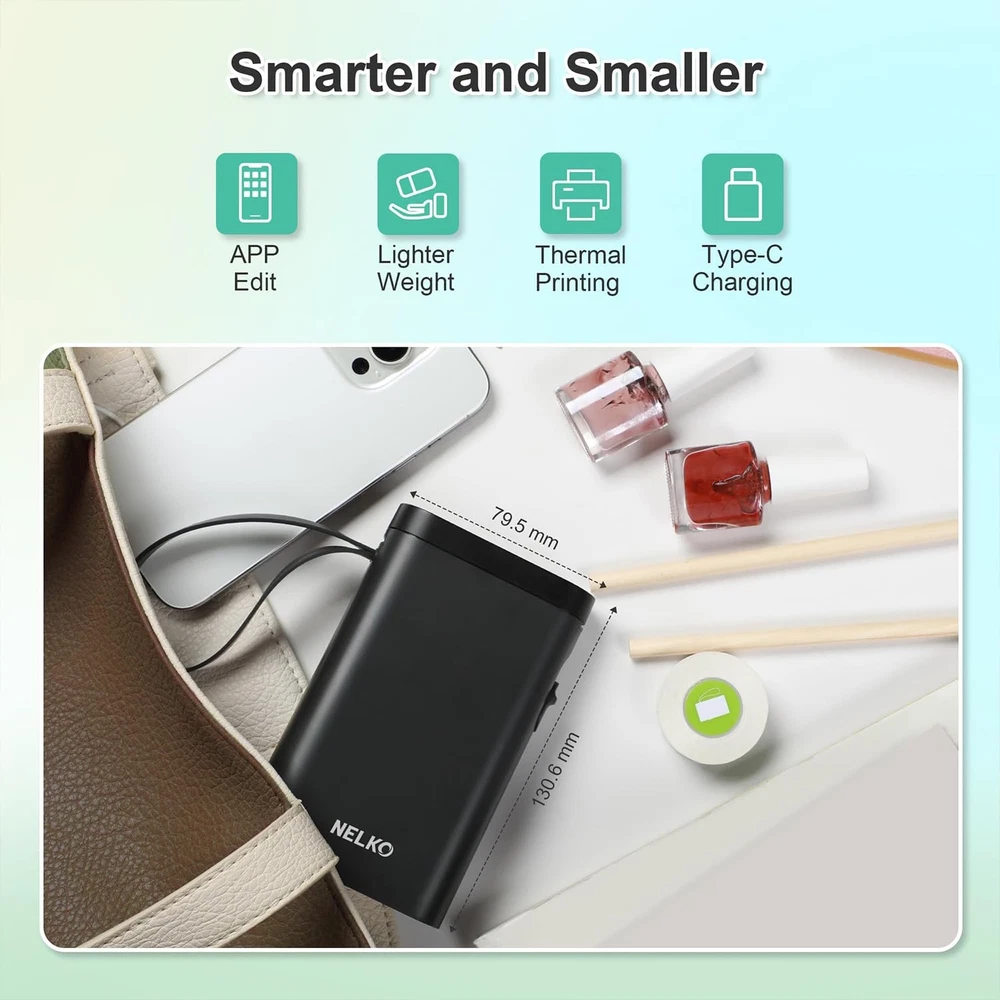 2025 New Version: Compared with the traditional label makers, half weight and size of the traditional label maker, smaller, smarter and convenient for users to carry. Wireless bluetooth label maker can slip into your pocket, allow printing anytime, anywhere. We recommend using our NELKO thermal label paper for good printing quality. Attention: For P21 Nelko APP iOS Users, Please update Nelko APP to the latest version V3.1.0 and iOS App compatibility requires iOS 13.0 or later High-quality Printing: Label Makers with BPA-Free Direct Thermal Technology. Equipped with high-speed chips and 203 DPI, you can enjoy high-definition without relying on ink or toner. Label maker built in durable rechargeable battery, it can work for a long time. This label maker is monochrome printout, which only prints black text. We can create color label and need to use color pattern label tapes for printing.(Note: Not including charging adapter, not suitable for fast charging adapter) Easy to Use: NELKO label printer compatible with IOS & Android via bluetooth connection. Step 1: Download "Nelko" APP from Google Play or App Store. Step 2: Install the paper roll. Step 3: Connect the P21 bluetooth within APP. Step 4: Choose a quick template and start printing. It is not compatible with Google phones on Android 14. This label maker machine with tape APP included more than 90 +Fonts, 10+ Languages, 450+ Materials. (Note: This label maker doesn't work with computers) Multiple Creative Function&Templates: This app of the label maker provides various features and templates, easy to create various design label stickers from App with Text, QR code, Barcode, Materials, Images, Time and Borders, etc. The length of labels is fixed, including 12X40mm, 14X40mm, 14x50mm, 14x75mm, and more. Please do not tear or destruct the green sticker on the back of the label strip , otherwise it will affect the printing effect. (Note: Continuous label tapes are not supported) Design Your Own Labels: The label maker machine with tape is widely used in life and office. For Home, organizing your clothes, food storage, cosmetics items, and mailings. For Office, office organization includes notebook tags, price tags, reminder tags, and other office supplies. For School, label maker for classroom teacher and kids school items, personal item identification, name tags. Labeler makers bring you fun and convenience