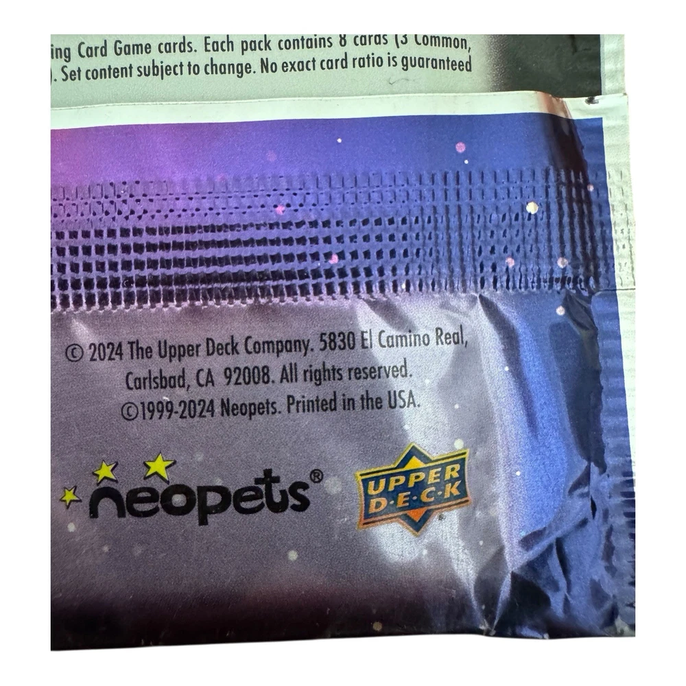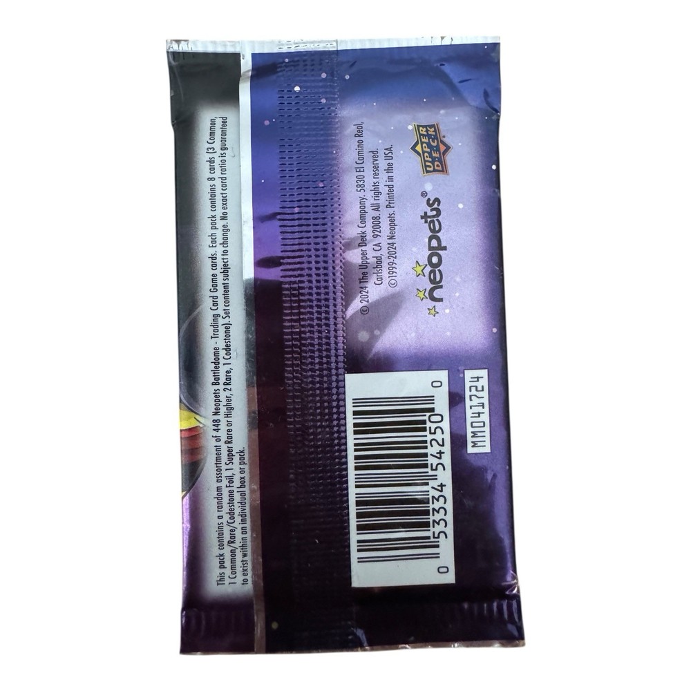 Brand new and sealed Neopets Battledome Trading Card Game booster pack by Upper Deck. This is from the 2024 release, Defenders of Neopia set. Great for collectors and fans of the Neopets universe. • Set: Defenders of Neopia • Year: 2024 • Condition: Factory sealed, new • Contents: 8 cards per pack (random assortment) • Manufacturer: Upper Deck • Licensed by: Neopets / The Upper Deck Company • Age: 6+ • Made in USA