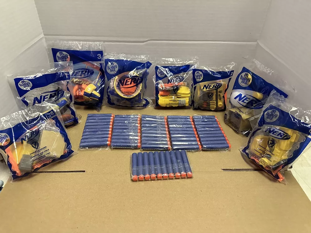 Complete set of eight McDonald’s happy meal Nerf toys And we have six packages of darts Non-smoking environment Make sure to give us a follow. And check out our store for more items like this.