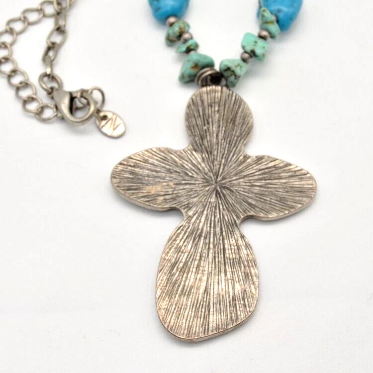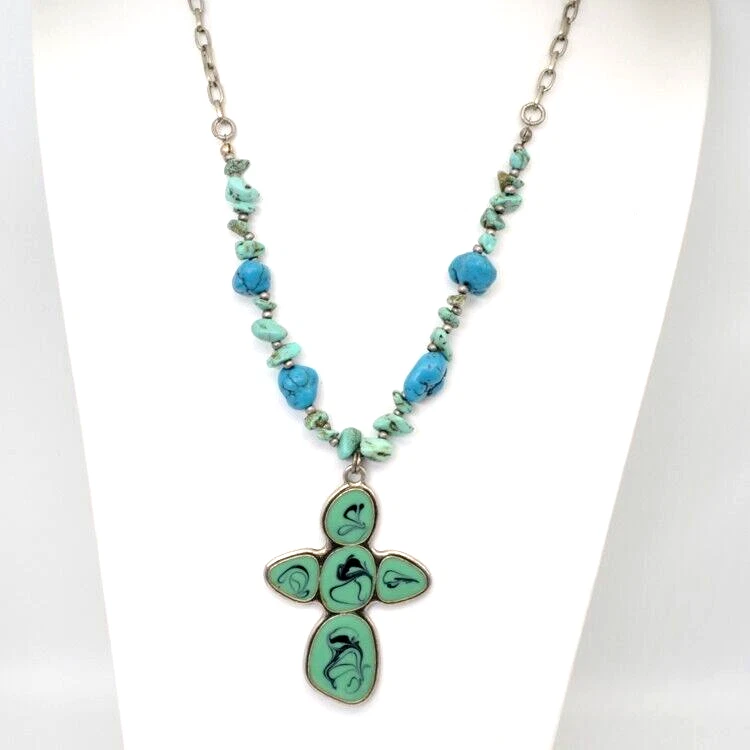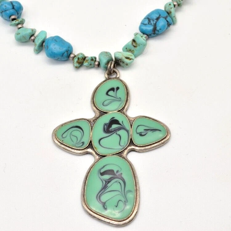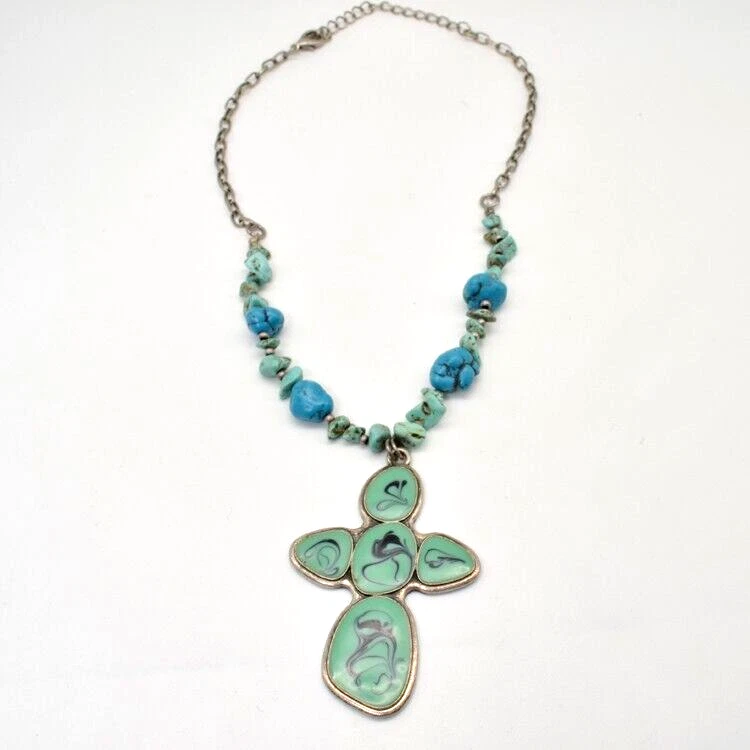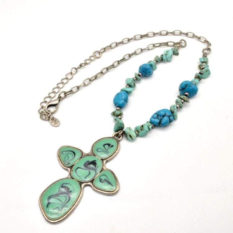 Nes Signed Necklace Cross Pendant. Pendant is 2 1/2 inches long. Enamel teal color with black swirls. Necklace has semi precious stones. I believe they are howlite and jadite. Necklace measures about 16 1/2 inches plus 3 inch extension chain. Quarter is for size reference and not included. Great gift for her: birthday, anniversary, or gift for yourself. As with any jewelry it is a choking hazard for small children. Thank you for viewing this item. Please check out my other listings on Ebay at Kentucky Fun Treasures! I will be happy to combine shipping whenever possible. Thanks!