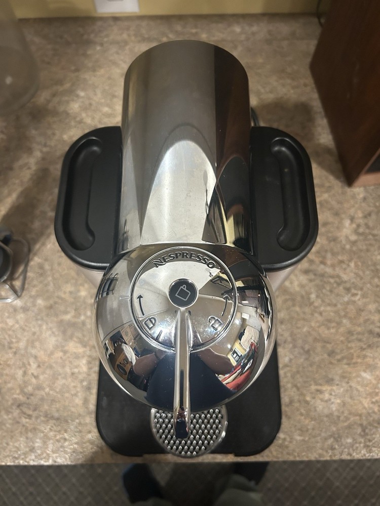 Nespresso Vertuo Coffee & Espresso Machine by Breville – Chrome with set of 4 ceramic espresso cups Gently used Nespresso Vertuo machine by Breville in great working condition. Brews a variety of coffee and espresso sizes using Vertuo pods with barcode scanning technology. • Chrome finish with sleek design • One-touch brewing system • Compatible with Nespresso Vertuo capsules only • Makes espresso, double espresso, gran lungo, coffee, and alto • Includes removable water tank and used capsule container Perfect for anyone looking for quick, high-quality coffee at home. Clean and ready to use. Pickup preferred. Let me know if you have any questions!
