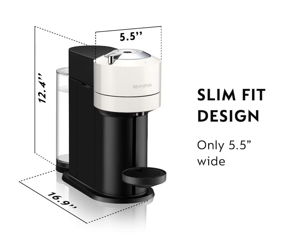 Sleek design and full versatility. With Vertuo Next, we are thinking bigger — whether it’s the size of your coffee or the technology that brews it. Everything except the machine size of course! - Brews a wide range of coffees at the touch of a button – espresso, double espresso, coffee (5oz, 8oz, 12oz), Carafe (18oz) - Automatically adapts brewing parameters to each capsule – cup size, pressure, temperature, brewing time - The first Nespresso machine made from 40% recycled plastic, without sacrificing style - Measuring only 5.5" wide, its slim fit design makes it the perfect addition to any kitchen or countertop. Vertuo Next White | Vertuo Coffee Machine | Nespresso USA