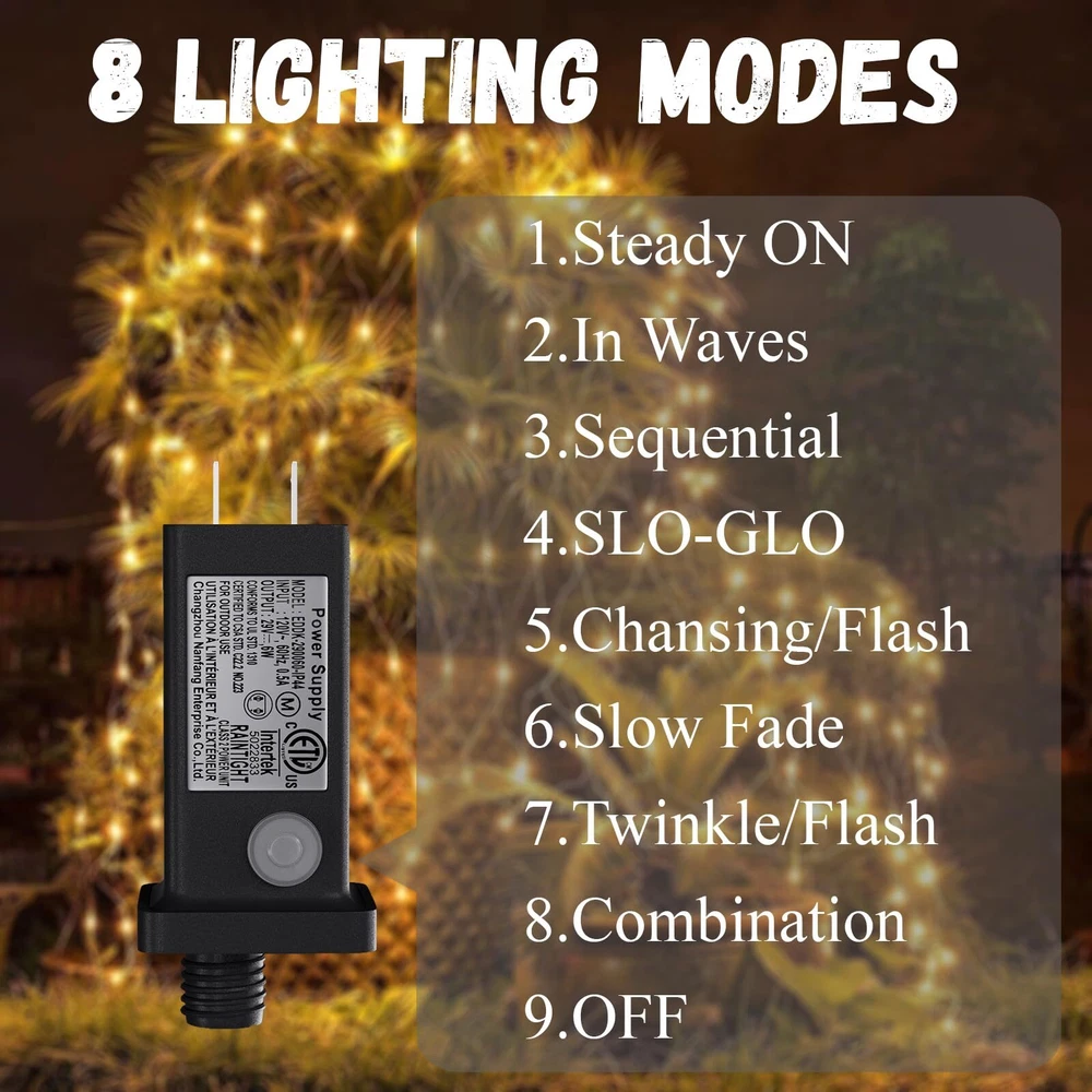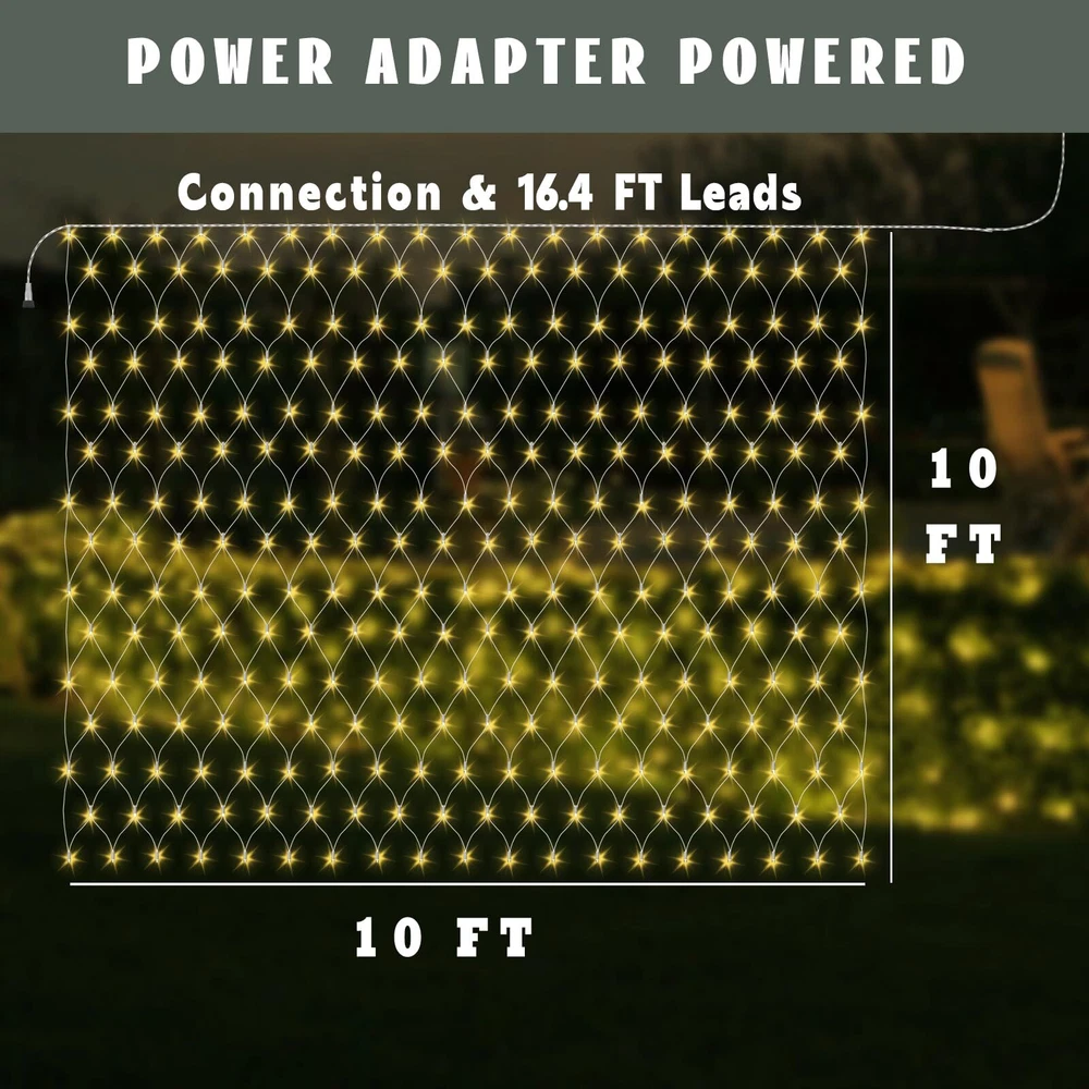 Net Lights Outdoor: Size 10FT×10FT with 270 LED, These net lights are perfect for enhancing the beauty of your spaces. Experience a stunning display of vibrant and radiant LED lights. With a generous 16.4 ft lead, these net lights provide you with ample length to easily connect them to a power source. 8 Lighting Modes: Choose from a variety of lighting modes to create the perfect ambiance for any occasion. From steady glow to twinkling patterns, the possibilities are endless. Connect multiple sets of net lights together effortlessly, thanks to the end-to-end connectable ports. Create a captivating display by extending the lights as far as you desire. Timer and Memory function: Activate the Timer and Memory function mode by simply long-pressing the button until it turns green. This mode enables the lights to stay on for 6 hours and then automatically turn off for 18 hours, with memory mode to remember your preferred setting. Great for wide applications: Whether you're celebrating a festival, hosting a party, or enhancing the beauty of Bushes and Lawn or other environment, these net lights are the perfect choice. These net lights utilize energy-efficient LED technology, providing you with long-lasting and environmentally friendly lighting solutions. Add a touch of fairy tale charm to your spaces with these beautiful and delicate fairy lights, that will leave everyone in awe. After-sales support:If you have any questions during the use, please contact us through Amazon, we will provide you with professional support!