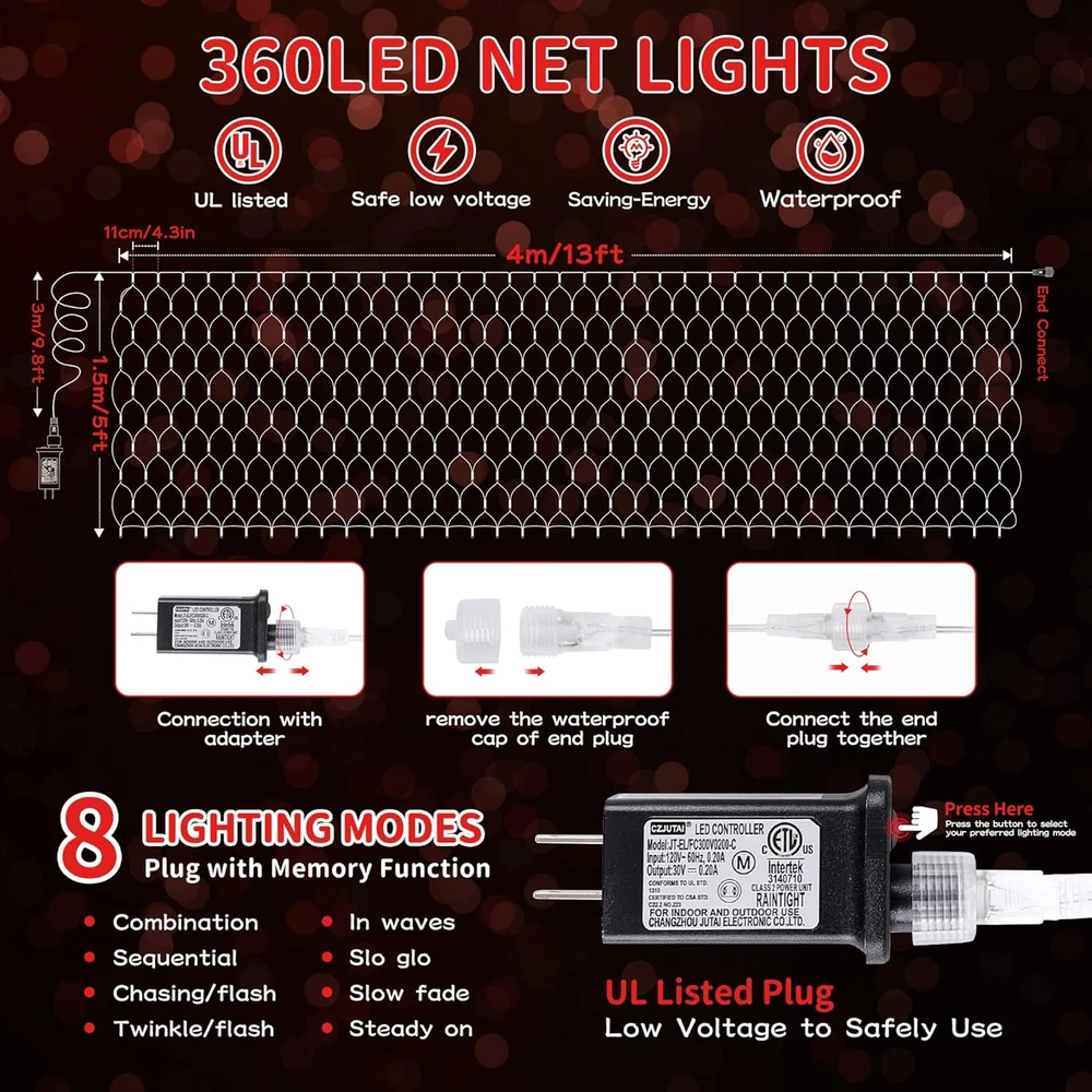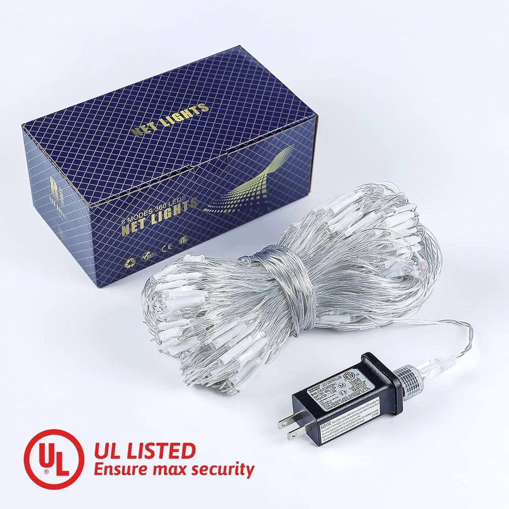 ღChristmas Net Lights & Connectable:HEYFUNI Christmas nets lights adopt 360L upgrade Super bright LED with UL Certified adapter. Mesh nets size is 13ft*5ft with 9.8ft lead cable. Come with a waterproof end-to-end connector, connect up to 3 sets to meet your needs for large or small area decor and bring sweet and charming atmosphere for any indoor and outdoor decoration. ღ8 Modes & Memory Function:The warm white mesh Christmas lights have 8 different Modes: Steady on, Wave, Sequence, Chase, Flash, Flash/Flash, Slow Flash and Slow fade.Just press the button on the plug,you can adjust the effect you want on any occasion. Build in Memory chip save your last modes setting and no need to reset mode every day. ღEnergy-Saving & Long Lasting:These outdoor mesh string lights have passed the authoritative UL588 safe certification,Each of our Christmas icicle lights adopts premium clear wire with insulation coating, which is corrosion resistant, aging resistant, more durable.The output voltage of the led icicle lights is 29V, the power of adapter is only 6W and the material of LEDs is made of high durability, compared with traditional Christmas net lights,it can saves up to 80% energy compared. ღIP44 Waterproof & Wide Use:The net lights made of high-quality of IP44 Waterproof design to make sure a long lifespan, perfect for rainy/snow weather and humid environment.The transparent net light with waterproof certified can be decorated both indoor and outdoor.Easy to cover bushes, grassland, treetops,walls,hedges,shrubs,fences,windows,balcony,garden,party,Halloween, Xmas etc. ღSatisfaction Guarantee:This lights will make your home and life lovely. We provide a 100% satisfaction experience is our main priority to our customers. 24hrs online service and unconditional exchange,refund or return service if you don't satisfy with the lights! ASIN