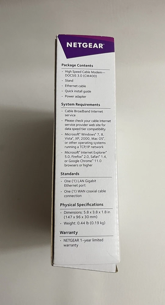 Connectivity:Single Ethernet (RJ-45) PortNumber of LAN Ports:1Model:netgear cm400Carrier:SpectrumFeatures:For GamingModem Device Type:Cable Modems & RoutersDOCSIS Standard:DOCSIS 3.0Maximum Downstream Data Rate:340 MbpsMaximum LAN Data Rate:1000 MbpsBrand:NETGEARColor:BlackType:Cable