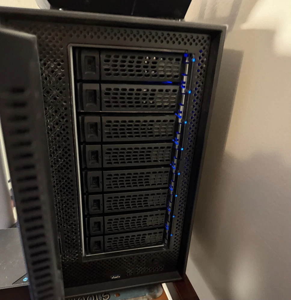 The NETGEAR ReadyNas NV428 is an 8-bay Network Attached Storage (NAS) device designed for storage-intensive applications. It supports a variety of drive types including SSDs, HDDs, and a combination of both, allowing for flexible storage configurations. With a storage capacity of over 100TB using larger drives, it is suitable for businesses or individuals with high storage needs. The NV428 features hot-swappable drive bays for easy maintenance and a Gigabit Ethernet interface for fast data transfers. Additionally, it includes USB ports for added connectivity options. It works perfectly, and the only issues are the LED screen on the front is a little faded (see photo). It has been factory reset. It will come empty for you to insert your own drives.