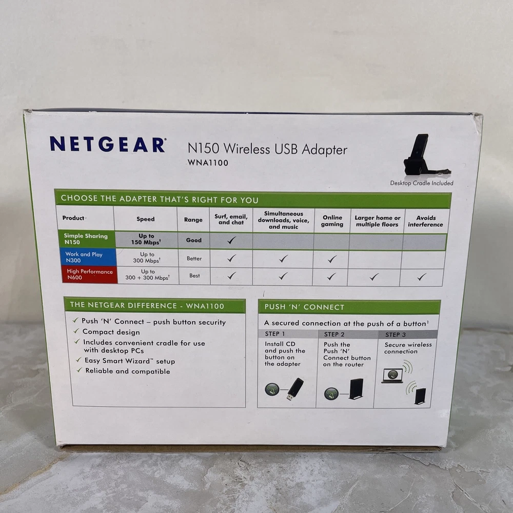 gtin13:606449067798Type:AdapterMPN:Wna1100Model:Netgear WNA1100 N150UPC:606449067798Country/Region of Manufacture:ChinaMaximum Wireless Data Rate:150 MbpsColor:BlackConnectivity:USB, WirelessBrand:NETGEAR