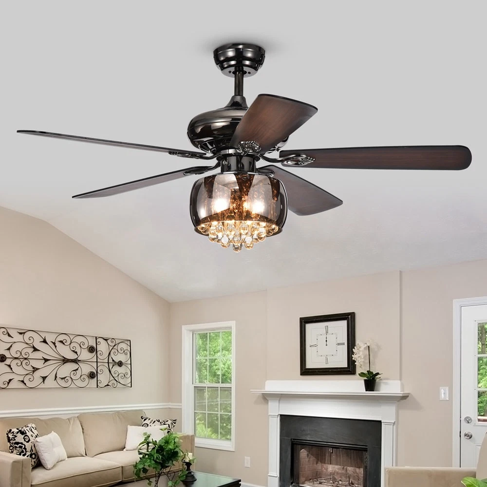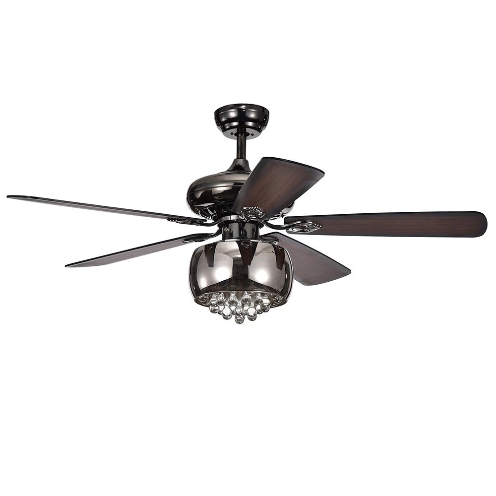 Stay cool and comfortable while adding elegance to your space with the Nettle 3-light Shaded Glass and Crystal 5-blade 52-inch Pear Black Ceiling Fan by Warehouse of Tiffany. The stunning chandelier crystals inside a shaded glass bowl offer brilliant illumination, while the reversible blades and three motor speeds let you adjust airflow to optimal comfort levels.Features: Elegant chandelier crystals inside a shaded glass bowl for brilliant illumination Reversible blades with 0-12 degrees blade pitch for optimal comfort levels Three motor speeds for customized airflow Includes a remote control switch for easy operation Requires (3) 25W bulbs (not included) Features a pear black finish and 5 wood blades for a stylish look Comes with a light kit Motor is reversible for year-round Free Shipping Over $49.99* Details Nettle 3-light Shaded Glass and Crystal 5-blade 52-inch Pear Black Ceiling Fan Product Description: Stay cool and comfortable while adding elegance to your space with the Nettle 3-light Shaded Glass and Crystal 5-blade 52-inch Pear Black Ceiling Fan by Warehouse of Tiffany. The stunning chandelier crystals inside a shaded glass bowl offer brilliant illumination, while the reversible blades and three motor speeds let you adjust airflow to optimal comfort levels. Features: Elegant chandelier crystals inside a shaded glass bowl for brilliant illumination Reversible blades with 0-12 degrees blade pitch for optimal comfort levels Three motor speeds for customized airflow Includes a remote control switch for easy operation Requires (3) 25W bulbs (not included) Features a pear black finish and 5 wood blades for a stylish look Comes with a light kit Motor is reversible for year-round use Additional information: Lamp TypeGlass Bowl Chandelier Lamp MaterialCrystals, Metal, Wood Number of Lights3 Lights Light Bulb TypeIncandescent Ceiling Fan LightLight Kit Included Finish ColorPear Black Motor speeds188 RPM (Level 1), 133 RPM (Level 2), and 77 RPM (Level 3) This product requires a Professionally Licensed Electrician for installation.