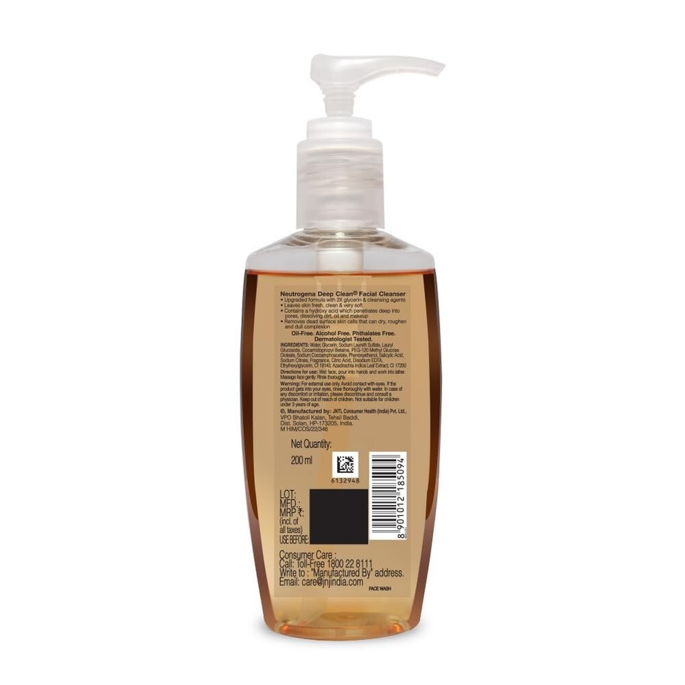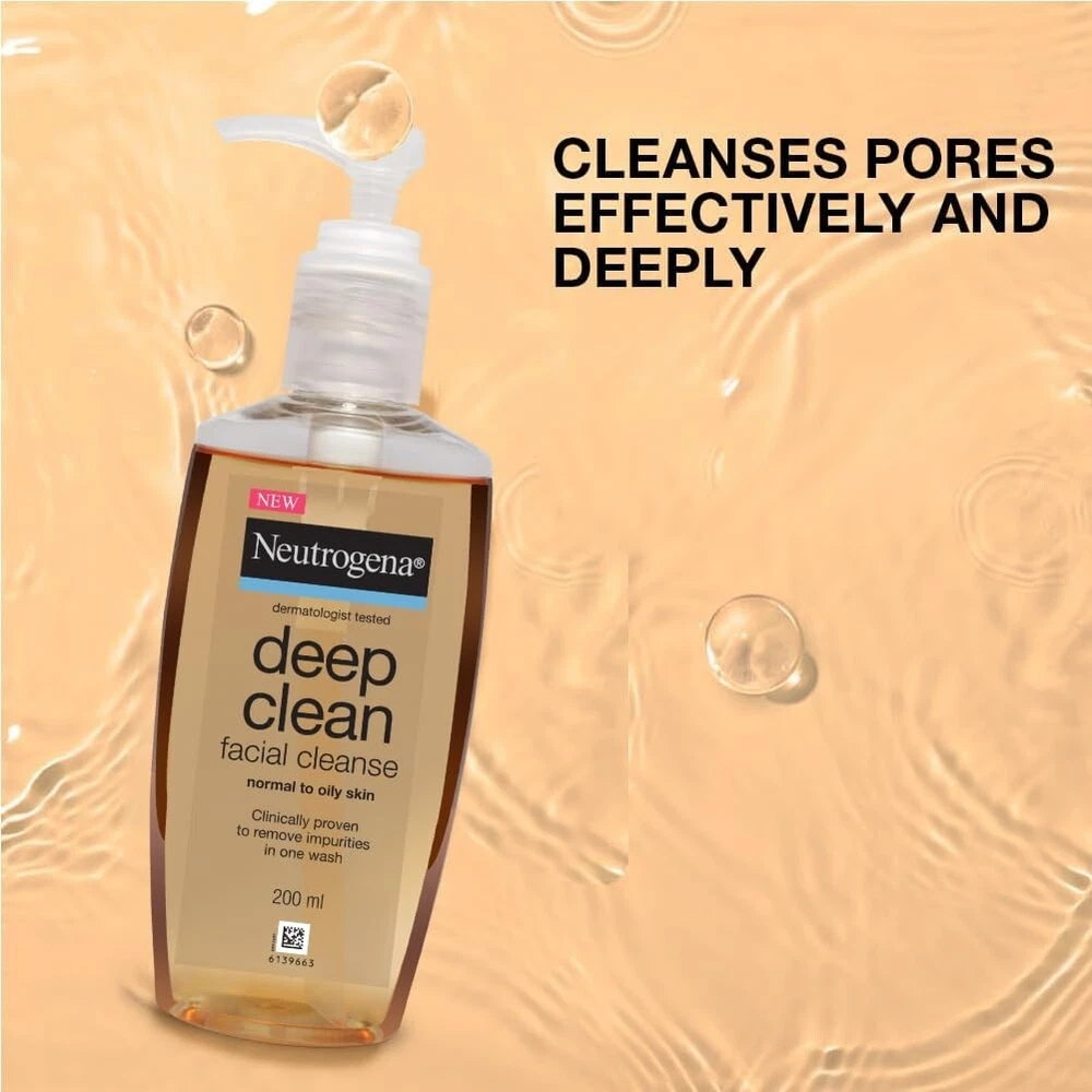 Ingredients: Water, Sodium C14-16 Olefin Sulfonate, Cocamidopropyl Betaine, Salicylic Acid, Sodium Chloride, PEG-120 Methyl Glucose Dioleate, PEG-80 Sorbitan Laurate, C12-15 Alkyl Lactate, Sodium Hydroxide, Disodium EDTA, Fragrance, Polyquaternium-7, Propylene Glycol, Yellow 5, Red 40 Product description Product Description Neutrogena Deep Clean® Facial Cleanser is a penetrating and thorough cleanser that improves the look and feel of skin, resulting in a fresh and healthy complexion. This face wash, suitable for women and men, leaves the skin feeling smooth and soft. Oil-free, alcohol-free. From the Manufacturer Experience Rejuvenated and Glowing Skin Treat your skin to a deep cleansing regime every day with the Neutrogena Deep Clean Facial Cleanser. This Deep Clean Facial Cleanser Neutrogena effectively cleans every pore and dissolves dirt, oil and make up, to reveal a clear, radiant skin, every time you wash. With its non-comedogenic effect, this Neutrogena deep cleanser cleanses your skin without leaving pores clogged and makes your skin healthy, smooth and soft by removing dead cells. This Neutrogena facial cleanser makes you feel fresh and rejuvenated, improves complexion, and keeps your skin glowing at all times. Look Fresh and Bright At All Times Wash your face every day with the Neutrogena Deep Cleanser and let your breathe with freshness. This oil-free face wash cleans the oily skin effectively and removes excess oil on the skin. With effective cleansing properties, this Neutrogena Deep Clean Cleanser thoroughly rids your skin of the impurities. This face was is suitable and effective for normal to oily skin types. For an effective wash, pump a coin-sized portion of the cleanser into your hands and work up lather gently in circular motion on your cheeks and entire face, except the eye area. Brand: Neutrogena Oil-free face cleanser Suitable for Normal to Oily Skin Non-comedogenic - cleans without clogging pores Removes dead cells and dissolves, oil and make up Works up lather for thorough cleansing Rejuvenates and makes skin healthy and glowing Quantity: 200 ml