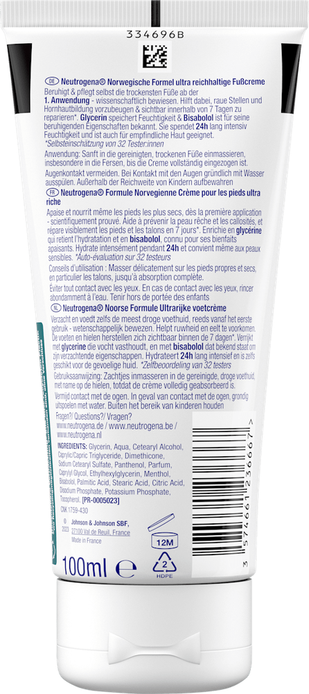 Ultra-rich formula specifically designed for dry skin Infused with soothing ingredients like Glycerin and Bisabolol Quickly absorbs and won't leave feet feeling greasy Developed with dermatologists for use on sensitive skin Moisturizes and prevents rough patches and calluses The Neutrogena Foot Cream is a highly moisturizing product, formulated with Glycerin and Bisabolol to provide intensive care for dry, sensitive feet. This ultra-rich cream, developed in collaboration with dermatologists, helps soothe the skin, lock in moisture, and prevent rough patches and calluses. To use, gently massage the cream into clean, dry feet, focusing on the heels until fully absorbed. Remember to keep out of reach of children and avoid contact with eyes. Ingredients: Glycerin, Aqua, Cetearyl Alcohol, Caprylic/Capric Triglyceride, Dimethicone, Sodium Cetearyl Sulfate, Panthenol, Parfum, Caprylyl Glycol, Ethylhexylglycerin, Menthol, Bisabolol, Palmitic Acid, Stearic Acid, Citric Acid, Disodium Phosphate, Potassium Phosphate, Tocopherol Manufactured by Johnson & Johnson SBF, 27100 Val de Reuil, France. For more information, visit https://www.kenvuecontact.com/