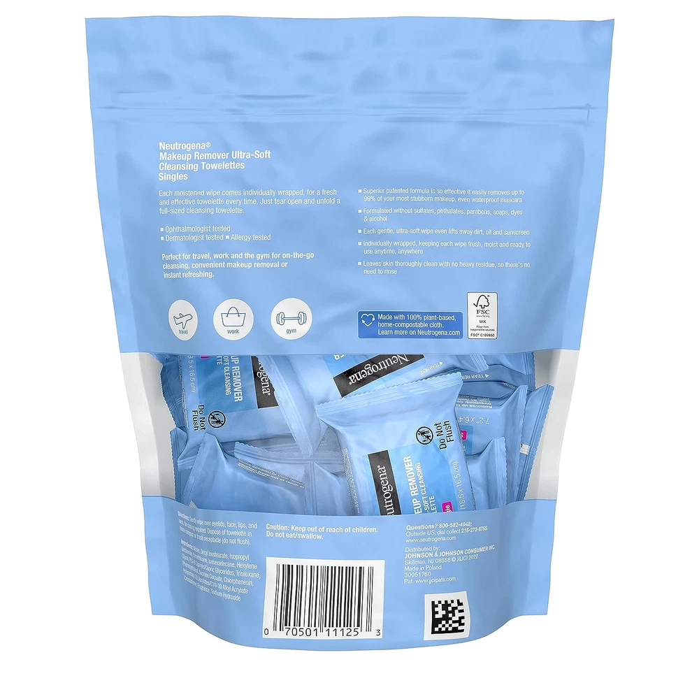 Pack of 20 individually wrapped moistened Neutrogena Makeup Remover Wipe Singles. Individually wrapped facial towelettes are perfect for on-the-go use. Protected from drying out, you always have a fresh wipe for complete cleansing & makeup removal Makeup remover face cleansing towelettes work to dissolve all traces of dirt, remove bacteria, impurities, oil and makeup on skin while also removing pollution, sweat and sunscreen, for superior cleansing and makeup removing power at your fingertips Facial cleansing wet wipes are ophthalmologist-, dermatologist-, and allergy-tested and gentle on the eye area. The effective formula removes up to 99% of makeup--even stubborn waterproof mascara--without tugging Single-use wipes are disposable and thoroughly cleanse skin gently and leave behind no heavy residue, so there's no need to rinse. Plus, they're great to use in a daily beauty or skincare routine for a refreshing self-care experience anywhere Our Clean Promise to you and the Planet. These facial cleansing wipes are made with 100% plant-based cloth, and are formulated without phthalates, parabens, sulfates, alcohols, soaps, or dyes Experience the convenience of Neutrogena Makeup Remover Wipes, in a pack of 20 individually wrapped singles for convenience, making them perfect for travel, work, the gym, or on-the-go use. Protected from drying out, you always have a fresh wipe for cleansing skin and removing makeup in one easy step. Formulated with a micellar-infused, triple emollient formula, these pre-moistened facial cleansing wipes effectively dissolve traces of makeup, including stubborn waterproof mascara, leaving your skin feeling clean, fresh, and moisturized. Gentle on the eye area, these wipes also remove sweat, sunscreen, and pollution without the need for rinsing, ensuring a quick and easy cleansing experience. Dermatologist-tested and allergy-tested, the wipes formula is free from phthalates, parabens, sulfates, alcohols, soaps, and dyes, ensuring a gentle cleansing experience. Elevate your daily skincare routine with Neutrogena Makeup Remover Wipes for effortless and refreshing cleansing wherever you go.