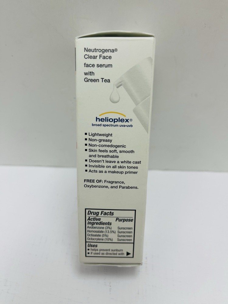 Neutrogena Clear Face Serum Sunscreen with Green Tea, SPF 60+. EXP 11/26 Lightweight Non-greasy Non-comedogenic Skin feels soft, smooth and breathable Doesn’t leave a white cast invisible on all skin tones Acts as a make up primer Free of fragrance Invnt brrnb103x