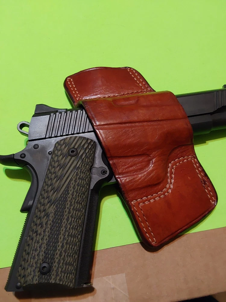 NEVADA GUN LEATHER 1911 STYLE R/H HOLSTER AS PICTURED I HAVE MY 1911 KIMBER 9MM FOR PICTURE PURPOSES ONLY. SHIPPED USPS GROUND ADVANTAGE IN BUBBLE ENVELOPE