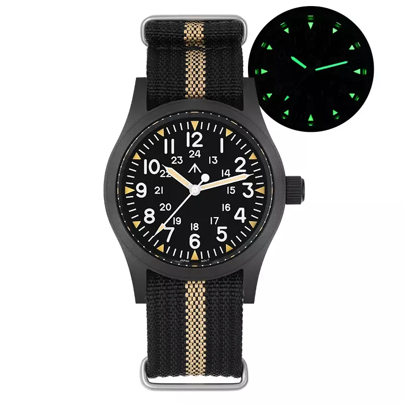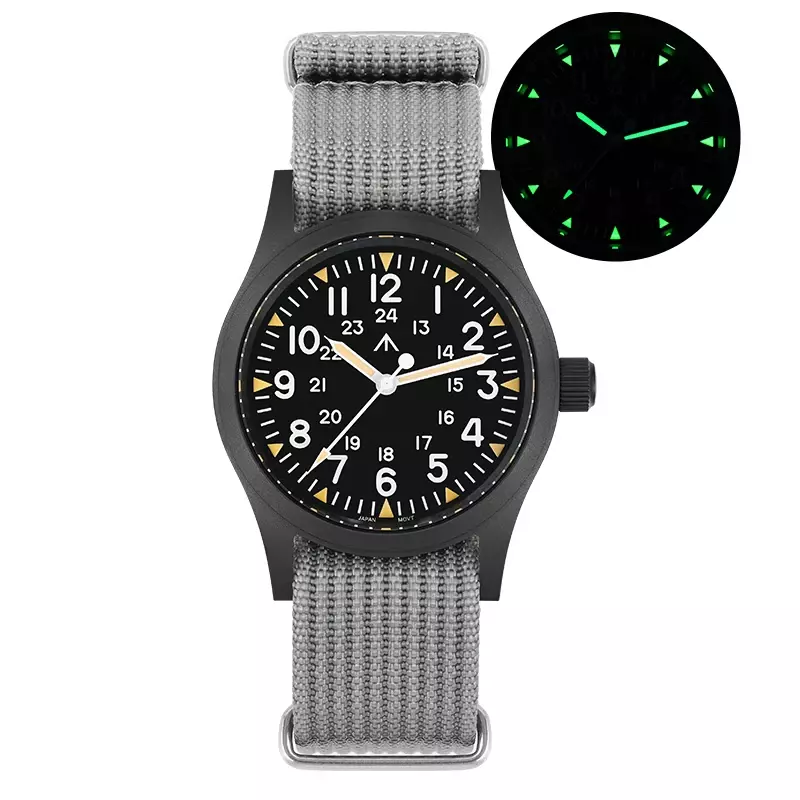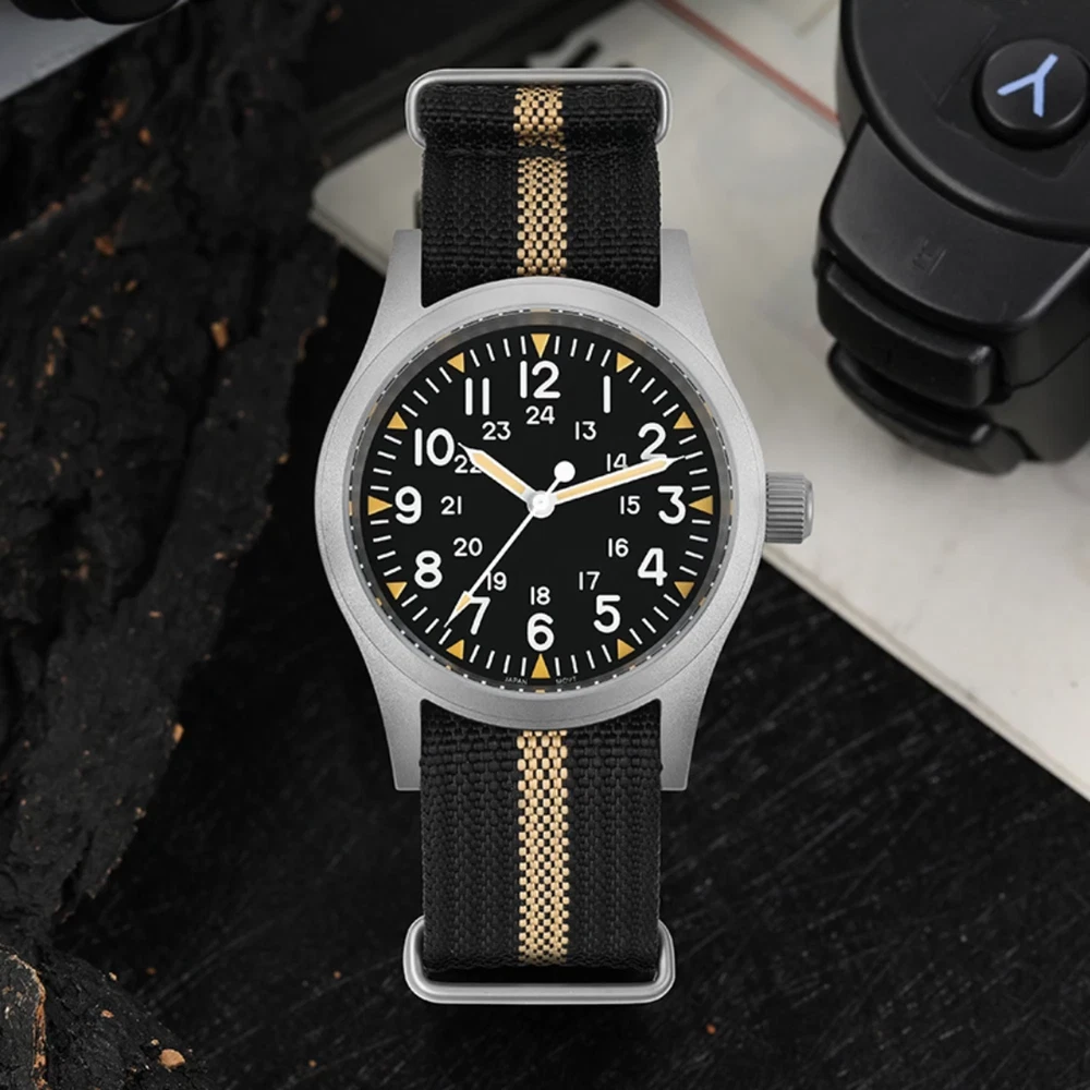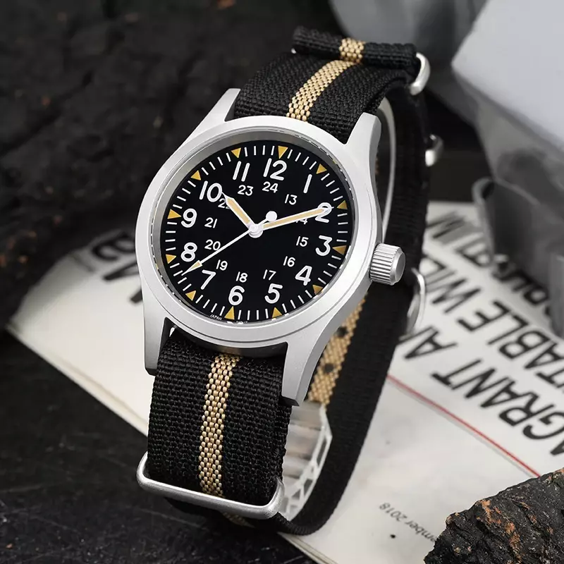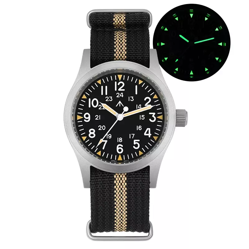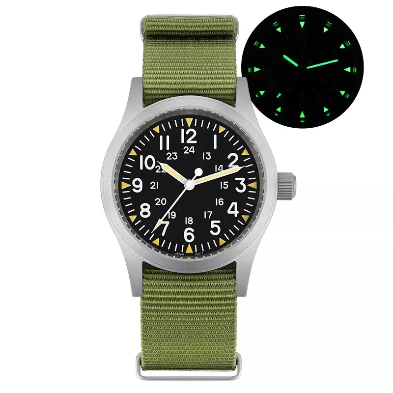 New 38Mm Watch Quartz Movement Field Watches Domed Sapphire Crystal Wristwatch This product data sheet is originally written in English. Militado ML05 38mm Vintage Watch VH31 Quartz Movement Field Watches Domed Sapphire Crystal With High Clear AR Coating Wristwatch Militado ML05 38mm 빈티지 시계 VH31 쿼츠 무브먼트 필드 시계 돔형 사파이어 크리스탈 고투명 AR 코팅 손목 시계 Buyers Wearing Watches Product Parameter Model: ML05 Field Movement: VH31 [Sweep Seconds Quartz] Crystal: Top Hat Domed Sapphire Crystal With High Clear AR Coating Case: 38mm diameter, sand blast Lug to Lug length: 47.5mm Thickness: 10.5mm Lug to lug width: 20mm Lug:drilled lug hole Bezel: Fixed Luminous: Super C3 Green Bracelet: Khaki Black or Green Nylon Strap Crown: Screw Down Water Resistant: 10Bar=100 meters Warranty: 2 Year 제품 매개변수 모델: ML05 필드 무브먼트: VH31 [스윕 세컨드 쿼츠] 크리스털: 높은 투명도 AR 코팅이 된 탑햇 돔형 사파이어 크리스탈 케이스: 직경 38mm, 샌드 블라스트 러그 간 길이: 47.5mm 두께: 10.5mm 러그 간 너비: 20mm 러그: 드릴로 뚫은 러그 홀 베젤: 고정 발광: 슈퍼 C3 그린 브레이슬릿: 카키 블랙 또는 그린 나일론 스트랩 크라운: 나사 고정 방수: 10Bar=100미터 보증: 2년 Militado ML05 38mm Vintage Watch VH31 Quartz Movement Field Watches Domed Sapphire Crystal With High Clear AR Coating Wristwatch Militado ML05 38mm 빈티지 시계 VH31 쿼츠 무브먼트 필드 시계 돔형 사파이어 크리스탈 고투명 AR 코팅 손목 시계 Buyers Wearing Watches Product Parameter Model: ML05 Field Movement: VH31 [Sweep Seconds Quartz] Crystal: Top Hat Domed Sapphire Crystal With High Clear AR Coating Case: 38mm diameter, sand blast Lug to Lug length: 47.5mm Thickness: 10.5mm Lug to lug width: 20mm Lug:drilled lug hole Bezel: Fixed Luminous: Super C3 Green Bracelet: Khaki Black or Green Nylon Strap Crown: Screw Down Water Resistant: 10Bar=100 meters Warranty: 2 Year 무브먼트: VH31 [스윕 세컨드 쿼츠] 크리스털: 높은 투명도 AR 코팅이 된 탑햇 돔형 사파이어 크리스탈 케이스: 직경 38mm, 샌드 블라스트 러그 간 길이: 47.5mm 러그 간 너비: 20mm 러그: 드릴로 뚫은 러그 홀 브레이슬릿: 카키 블랙 또는 그린 나일론 스트랩 방수: Brand Does not apply Department Does not apply band material type Nylon display type Arabic numeral markers hign-concerned chemical none feature Water Resistant band length 17 style simple clasp type Buckle origin Mainland China movement VH31 [Sweep Seconds Quartz] water resistance depth 10Bar case material STAINLESS STEEL case thickness 10.5 boxes & cases material Plastic model ML05 case shape Round dial window material type Sapphire Crystal item type Quartz Wristwatches crystal Domed Sapphire Crystal With High Clear AR Coating case 38mm diameter luminous Super C3 Green crown Screw Down water resistant 10Bar=100 meters choice yes semi_choice yes Type Does not apply