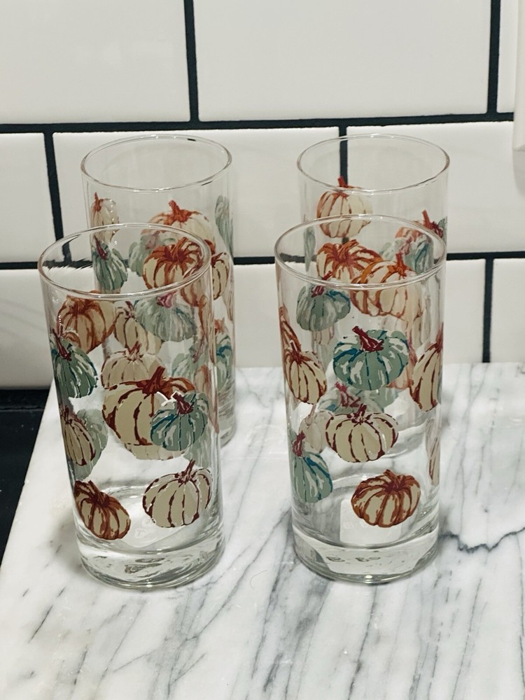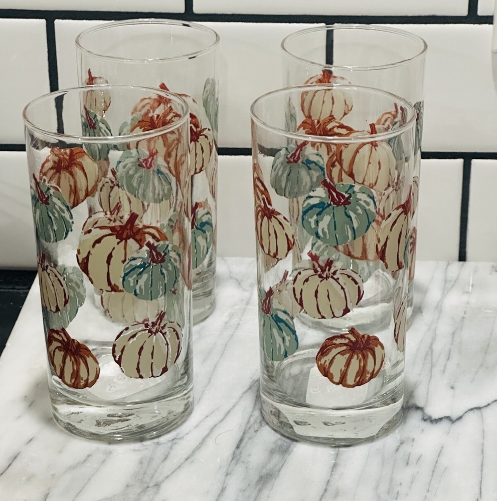 This set includes 4 Greenbrier International drinking glasses, each with a capacity of 16 oz. The glasses are decorated with a fall-themed pumpkin design in shades of orange, blue, and beige, making them perfect for adding a festive touch to your table setting during autumn. Made of glass, these drinking glasses are ideal for serving beverages to guests or enjoying a refreshing drink on your own. These pumpkin-themed glasses are a stylish and seasonal addition to your dining collection.