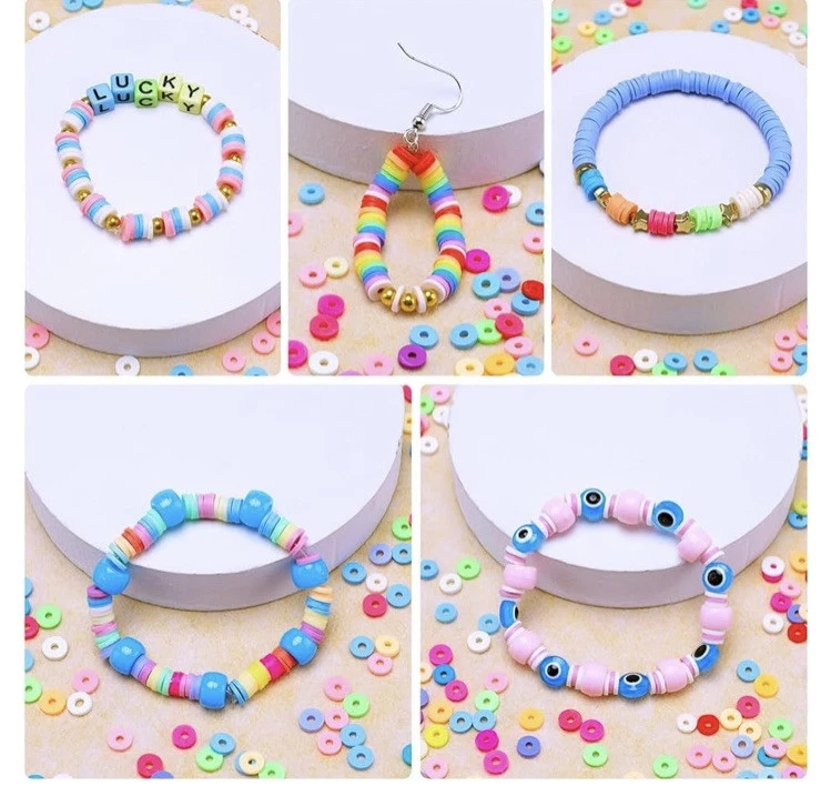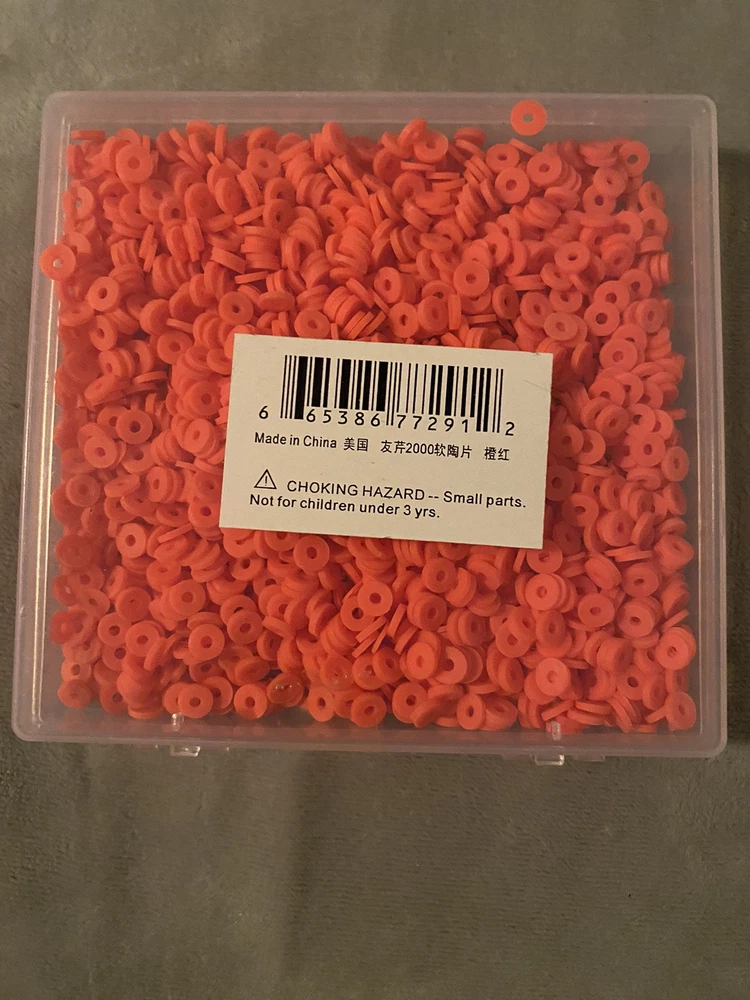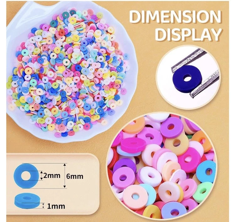 The product is a set of new 6mm vinyl heishe polymer clay African rondelle beads in an orange-red color. The beads have a 2mm hole size and are made of clay material. They are shaped like rondelles and each bead measures 6mm in size. Ideal for crafts and jewelry making projects.